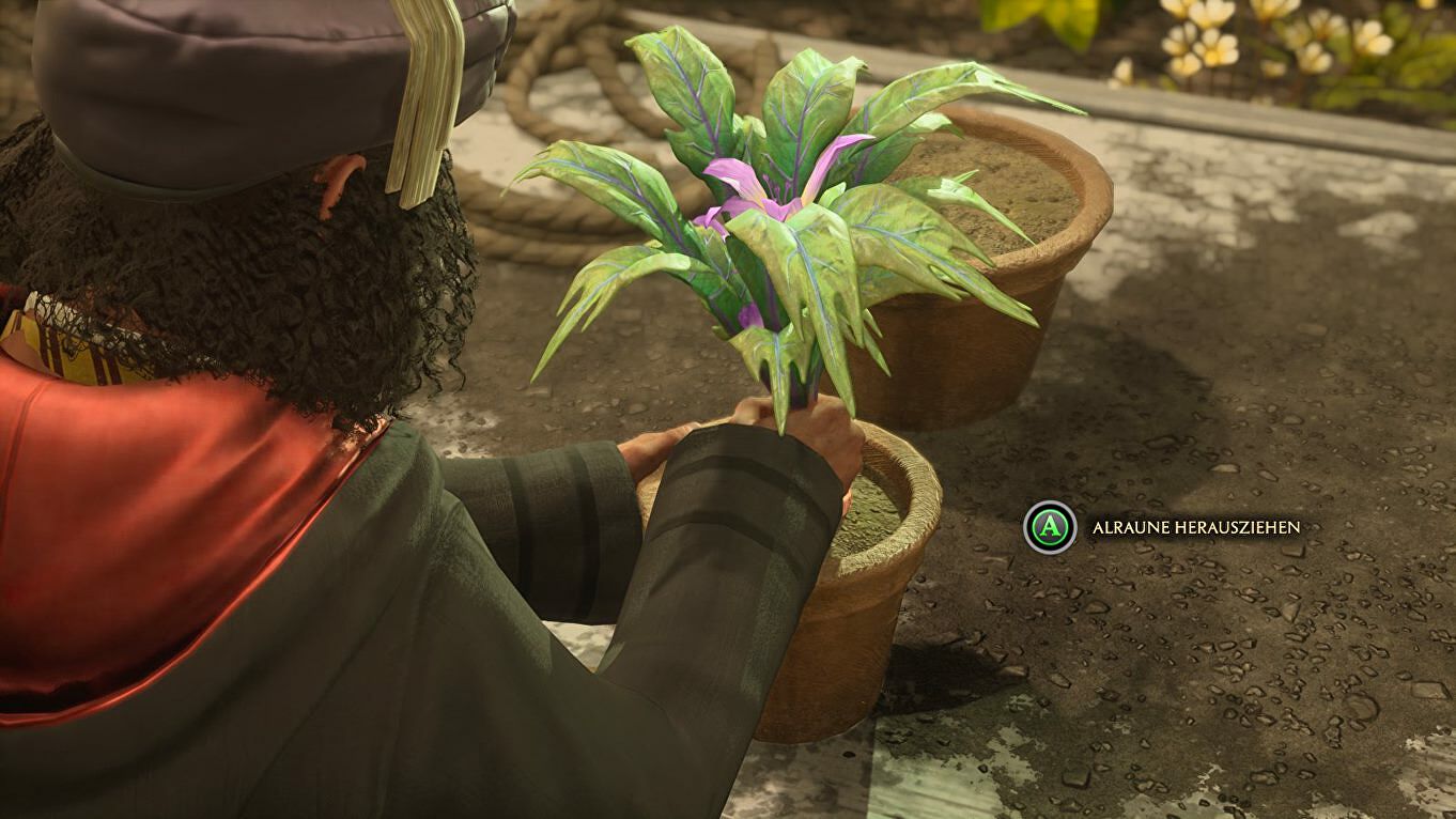 De eerste taak die we moeten uitvoeren is een Mandrake uit een pot trekken door op de knop te drukken die op het scherm verschijnt. De Mandrake maakt echter een hels lawaai tot we deze terug in een pot doen.