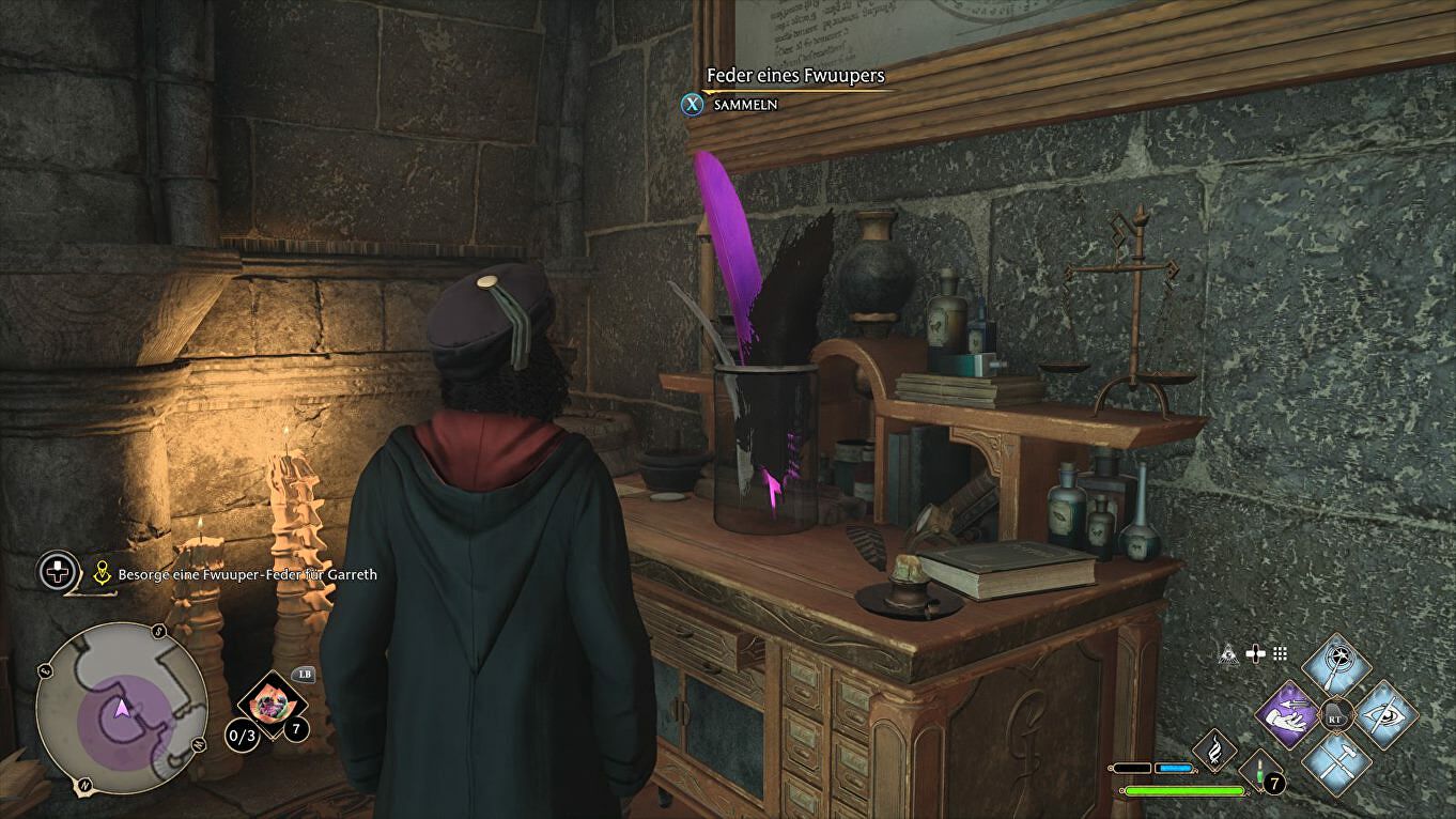 Beide ingrediënten zijn namelijk gemakkelijk te vinden in Professor Sharp's kantoor. Net voor je naar binnengaat wordt je echter betrapt door Garreth Weasley die in ruil voor zijn stilzwijgen vraagt dat je ook een Fwooper feather meebrengt.