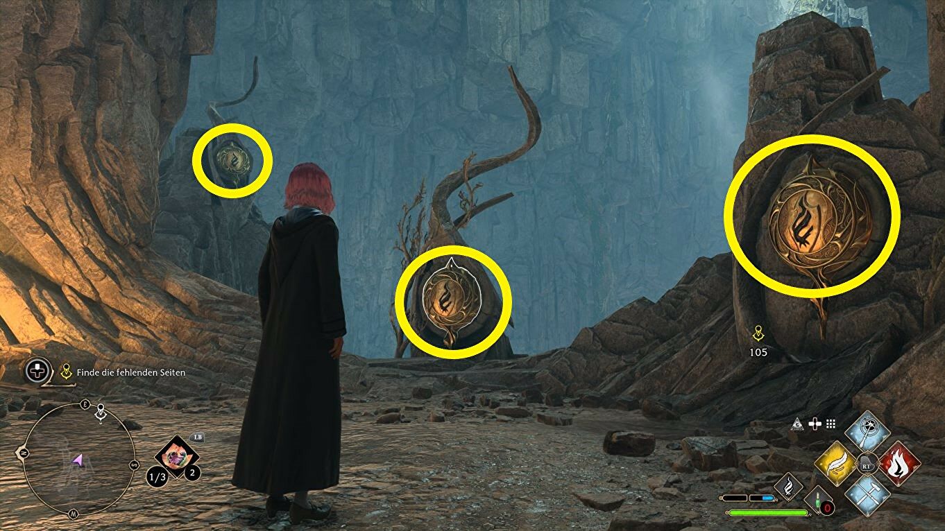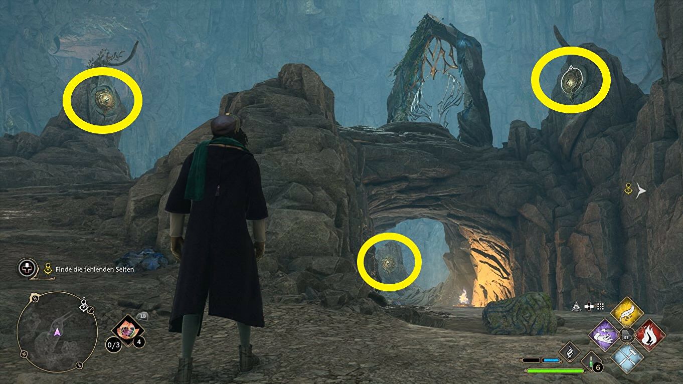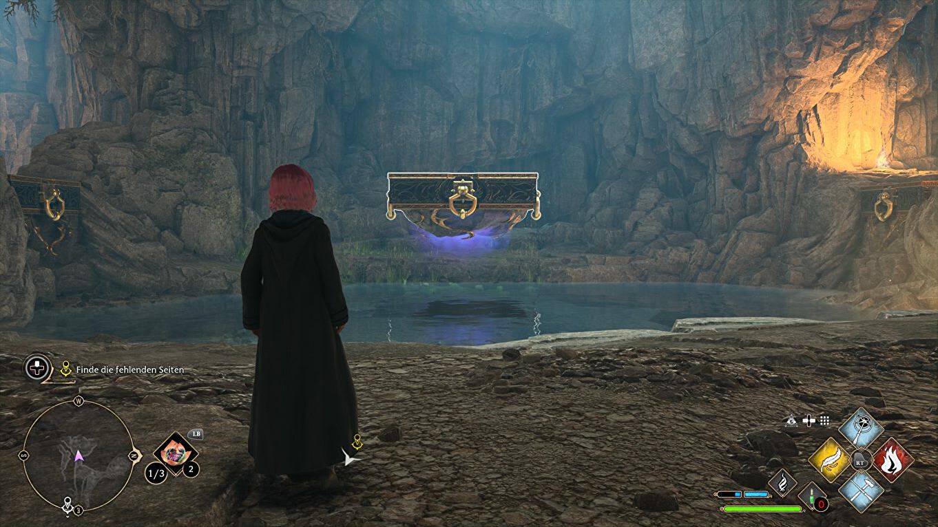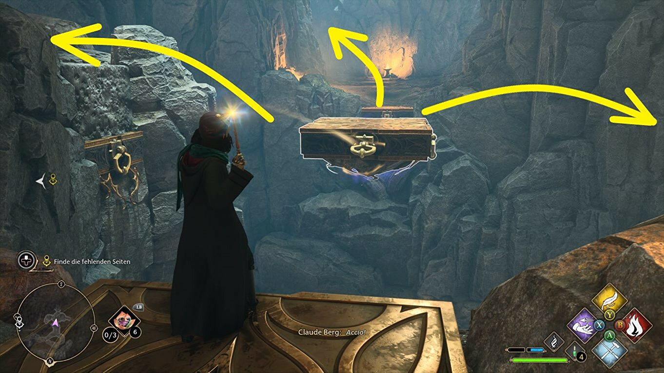 Verlaat het spinnennest opnieuw, en volg het pad rechts naar beneden. Ga links verder naar de marker. Rechts heb je ook enkele platformen die je met Accio omhoog kunt brengen. Via die platformen kan je een verborgen gebied bereiken met nog een kist.