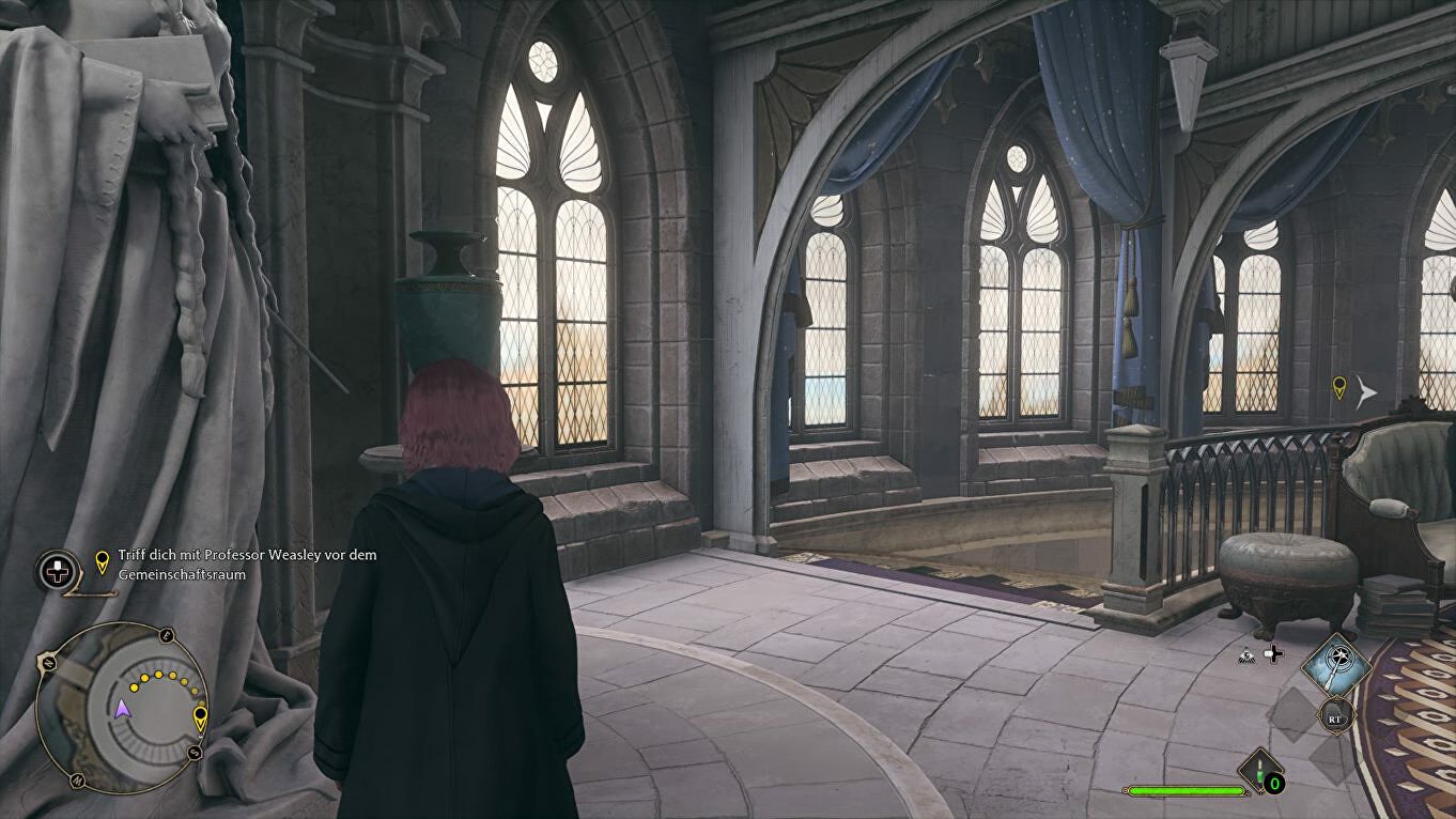 We krijgen een Wizard's Field Guide en moeten Weasley volgen. Afhankelijk van het huis waartoe je behoort, verschilt het pad enigszins. Als we bijvoorbeeld de trap afgaan, komen we (als lid van Ravenclaw) langs deze buste: