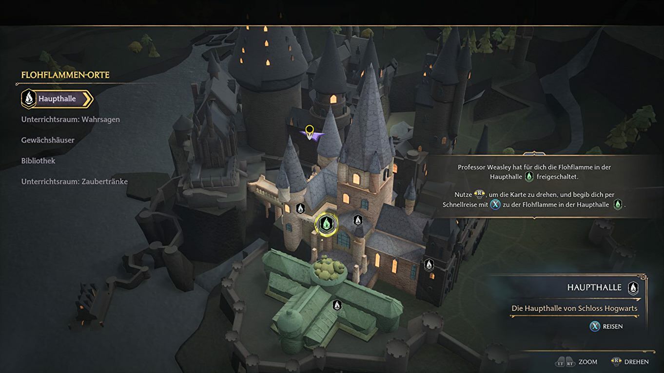 Op sleeptouw van Weasley banen we ons eindelijk een weg naar het eerste Floo Flame fast travel punt en krijgen we meer uitleg over hoe de kaart werkt in de game.
