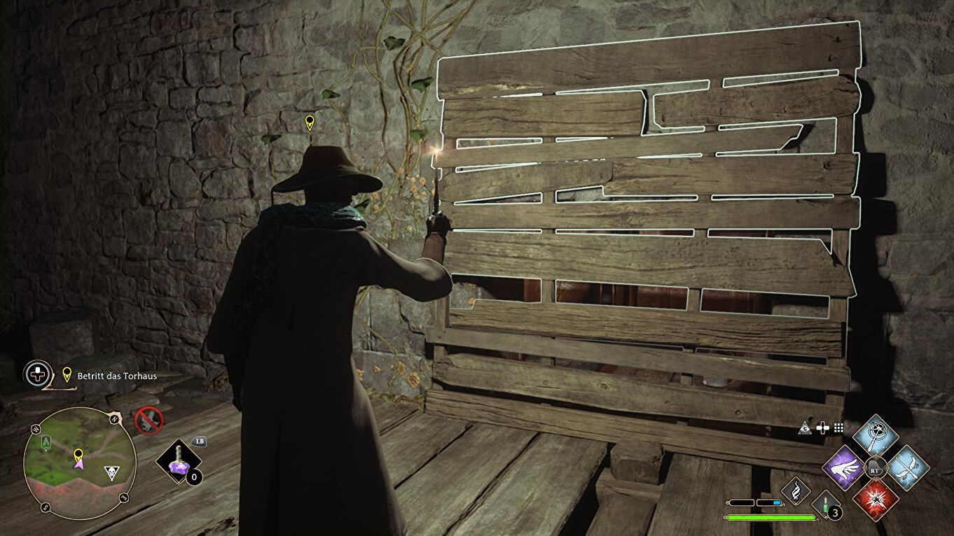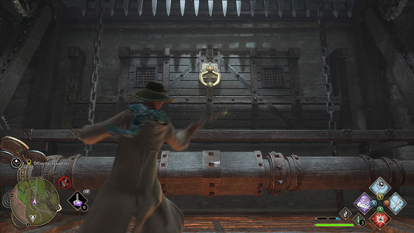 In de nieuwe ruimte moet je het mechanisme van de poort met Depulso raken om zo Natty binnen te laten. Wanneer de poort omhoog is, moet je opnieuw Accio gebruiken op de hendel om hem open te houden: