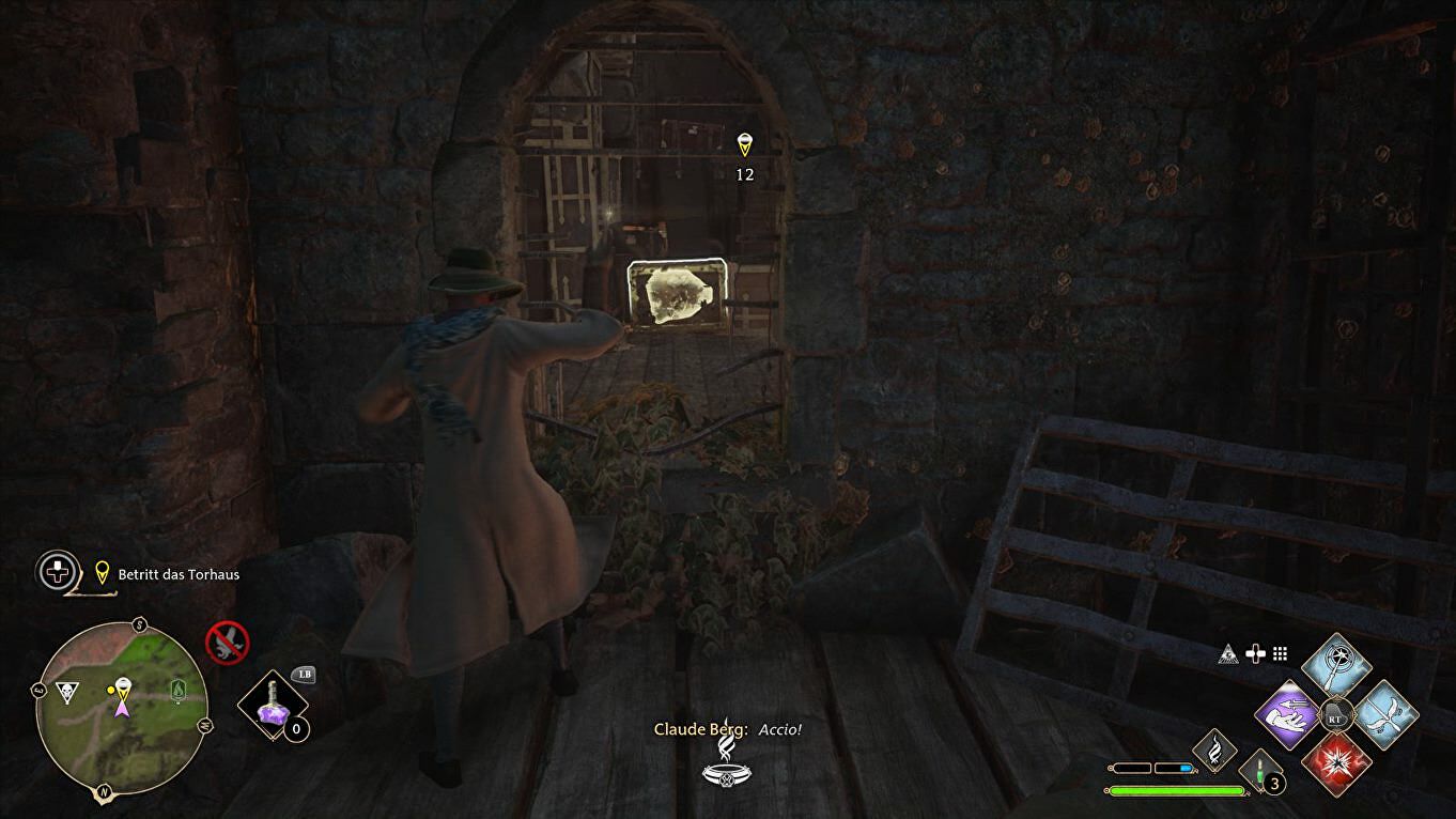Vernietig het met Depulso en sluip naar binnen tussen de kratten door. Helaas blokkeert een krat je de weg. Ga dus terug en naar links waar je een open raam ziet naast een doodlopend pad. Trek hier het blokkerende krat weg met Accio.