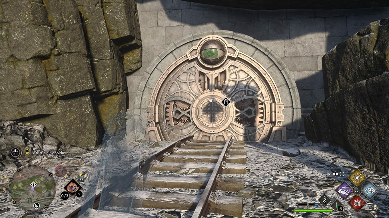 Volg het pad langs de spoorlijn naar de ingang van de mijn. Je kan de deur met het grote oog enkel openen als je jezelf eerst onzichtbaar maakt met Disillusionment. Gebruik de spreuk niet vlak voor het oog, maar een eindje verderop. Als het oog je ziet onzichtbaar worden, weet het nog steeds dat je er bent.