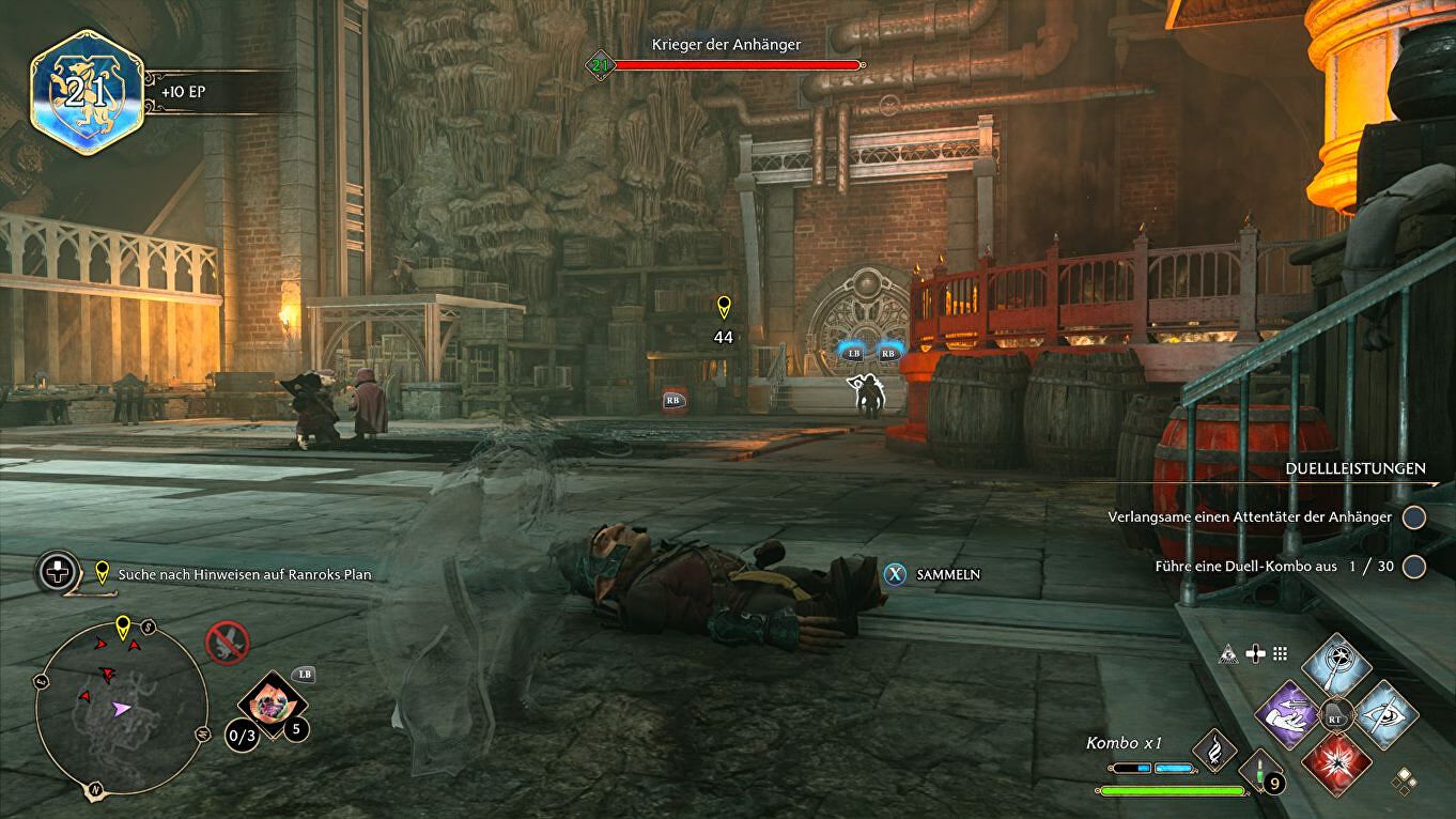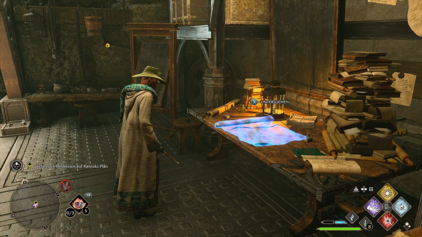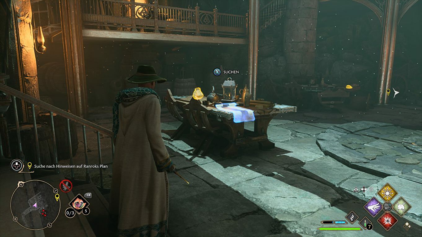 Gebruik Revelio in deze kamer, en interacteer met alle blauw oplichtende voorwerpen. Kijk vooral op tafel. Ga dan links de trap op, en dood de drie goblins in de kamer ernaast.