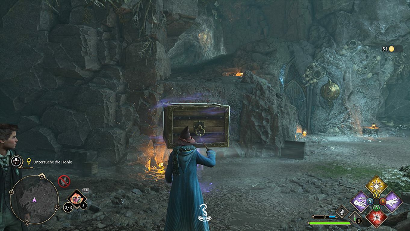 Til de kist rechts op met Wingardium Leviosa, plaats hem voor de rotswand zodat je erover kunt klimmen en naar het gebied ernaast gaan.