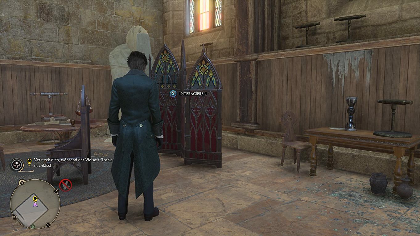 De Polyjuice Potion verliest langzaam zijn kracht. Om niet ontdekt te worden, moeten we snel het gebied verlaten en naar de marker gaan in de kleedkamer. We worden terug onze eigen zelve.