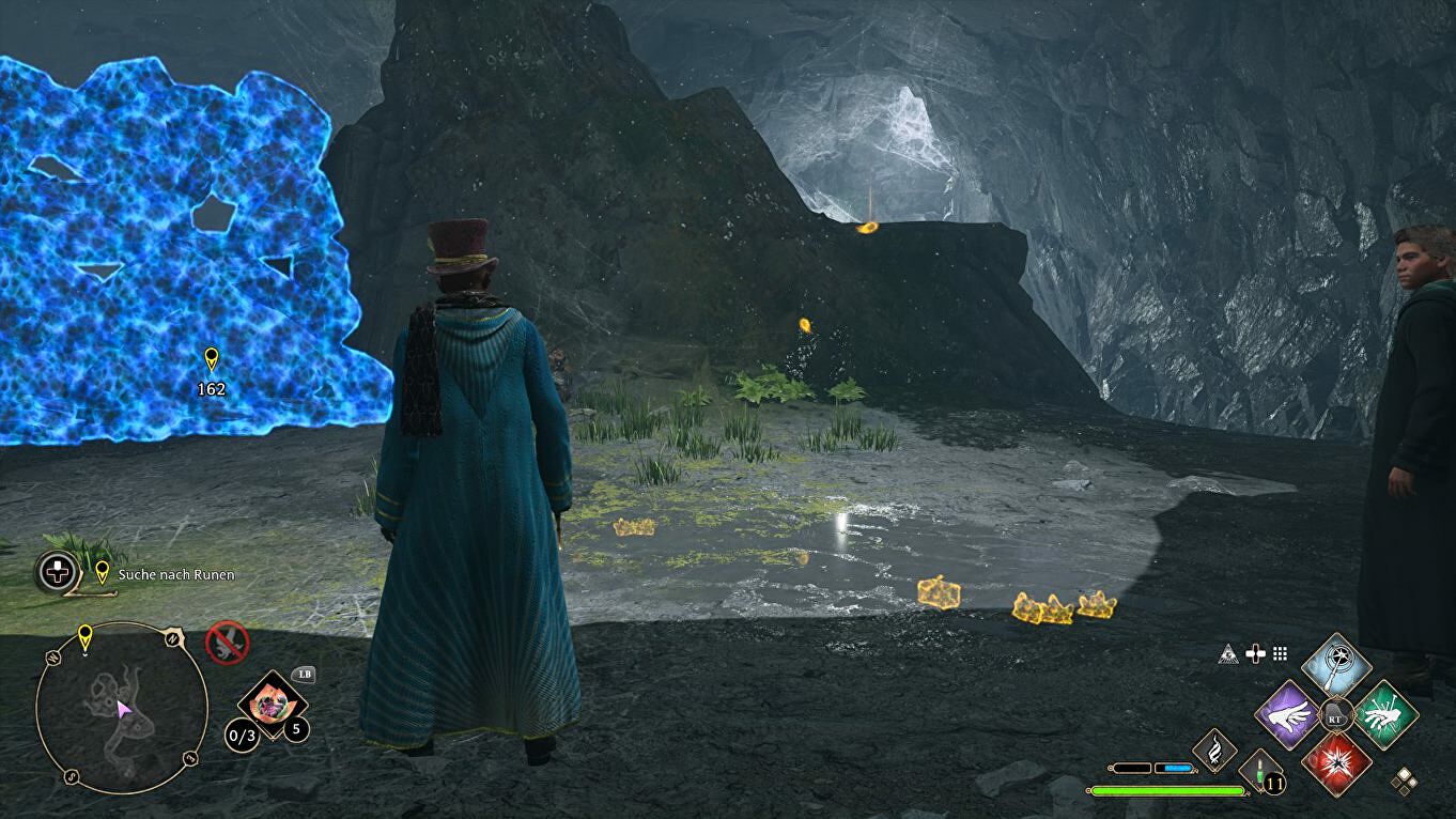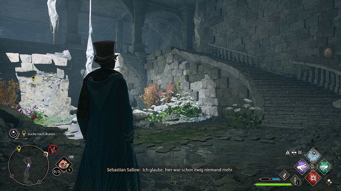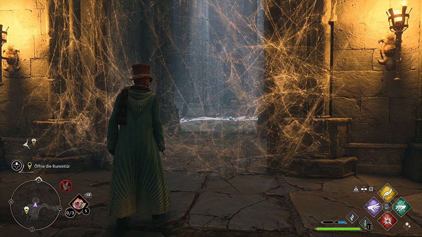 De derde rune zit links van de deur verbrogen achter een afbrokkelende muur. Die kan je uit de weg ruimen met Depulso. Activeer ze snel na elkaar en de deur gaat open.