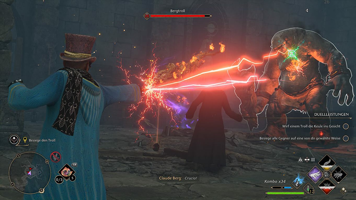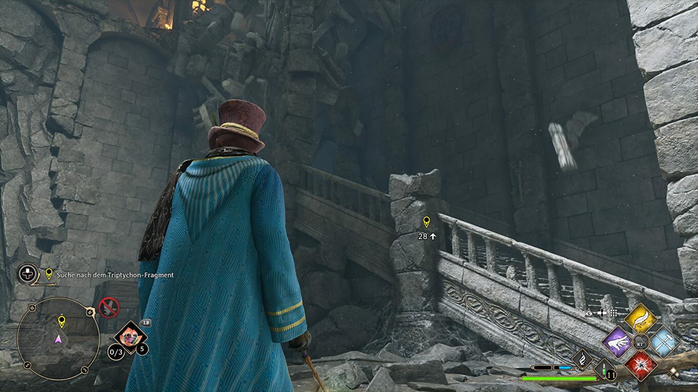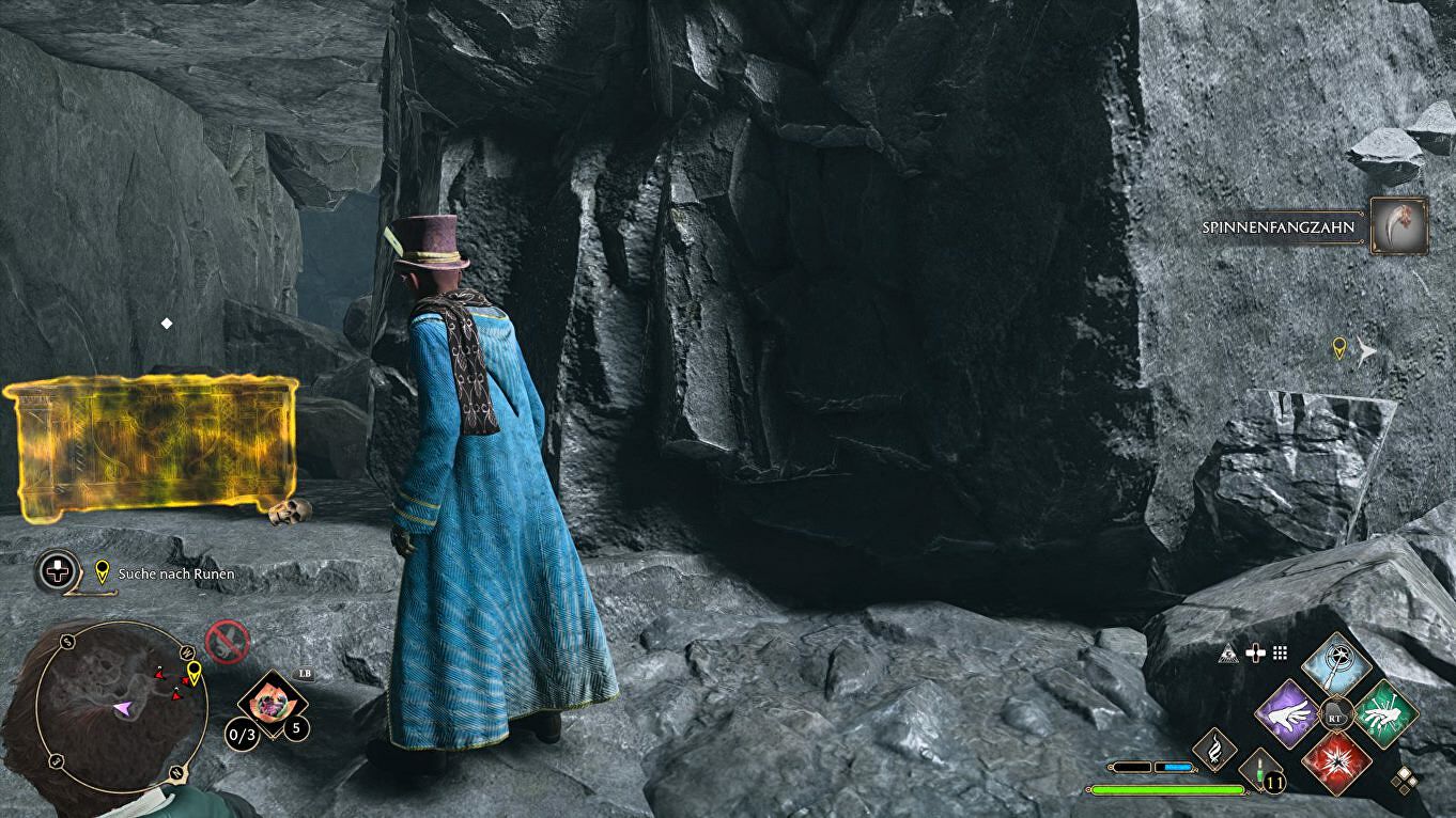 De derde rune zit links van de deur verbrogen achter een afbrokkelende muur. Die kan je uit de weg ruimen met Depulso. Activeer ze snel na elkaar en de deur gaat open.