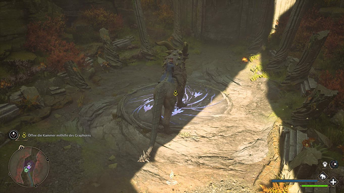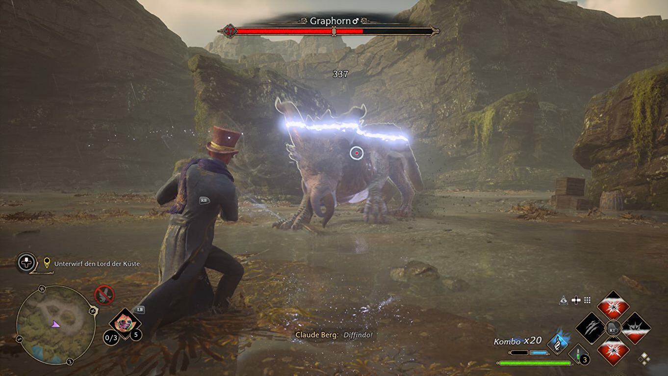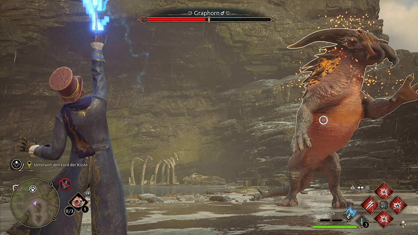 Als de Graphorn je probeert te rammen, ontwijk hem dan op het laatste moment en counter met een paar spreuken. Vergeet ook niet de voorwerpen in de omgeving naar hem toe te gooien voor wat extra damage.