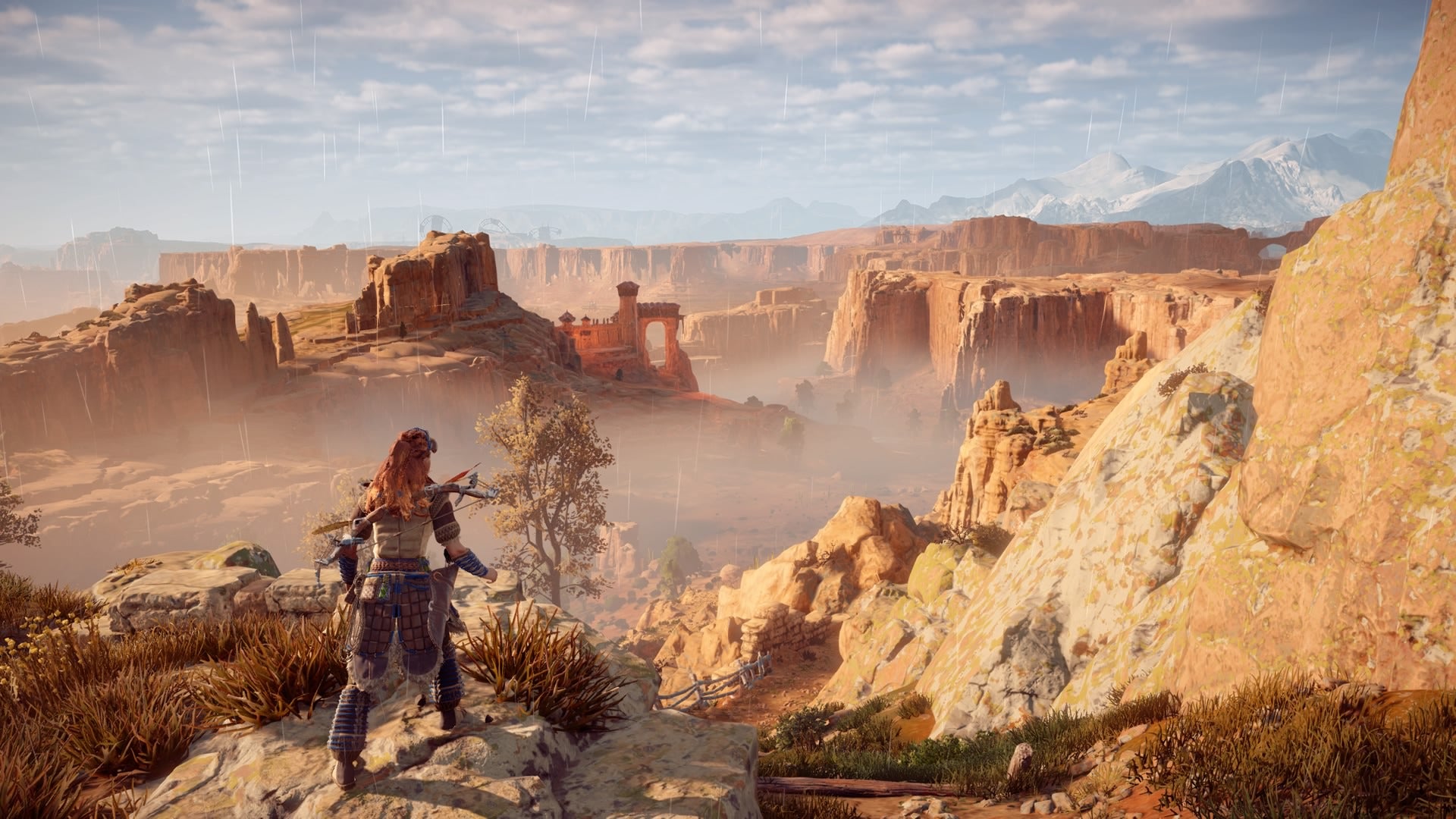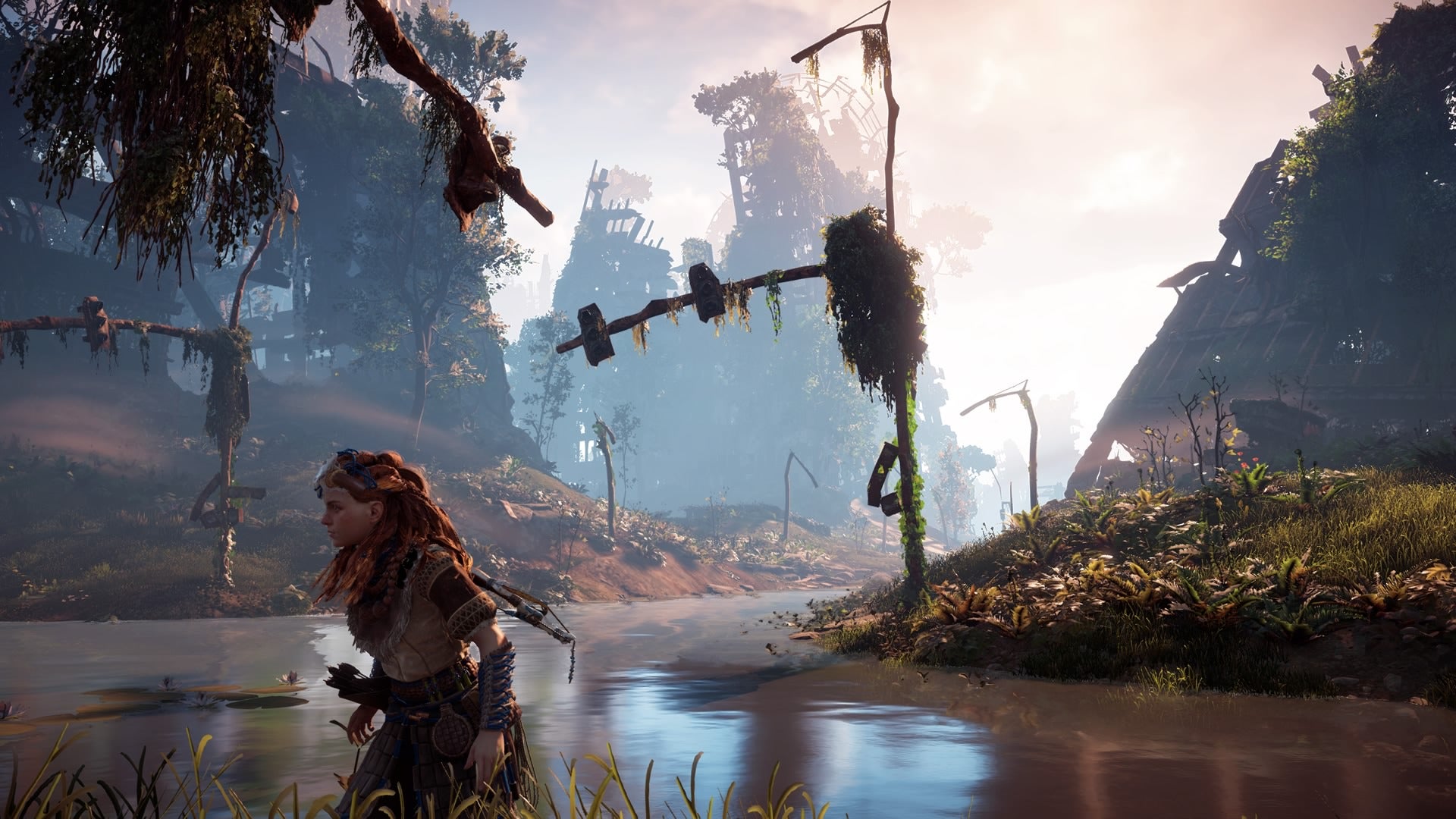 De ontwikkelaar blijft echter wel trouw aan de drang om op gebied van graphics grenzen te verleggen. Horizon Zero Dawn is een grafische triomftocht en de meest verbijsterend mooie consolegame ooit gemaakt. Omgebogen lantaarnpalen flankeren ondergelopen straten, het ruwe zand van de Carja-regio is zo gedetailleerd weergegeven dat je het haast tegen je huid voelt schuren en bossen en nabijgelegen meertjes baden in de zachte, roze gloed van de ondergaande zon. De wereld strekt zich bovendien kilometers ver uit, en je wilt steeds verder gaan om nog één bergflank of vernielde stad te verkennen, al is het maar voor de buitengewoon mooie uitzichten.
