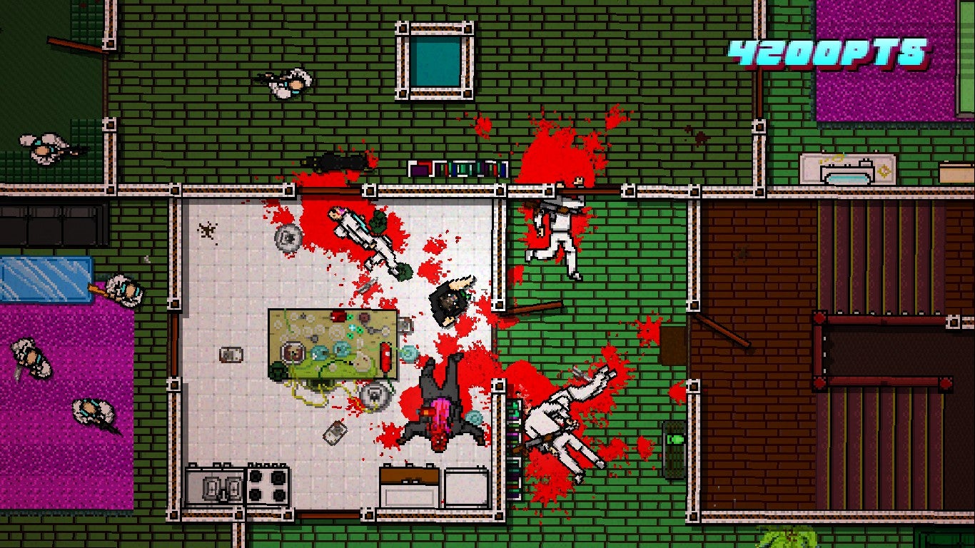 Maar wees gerust, hier krijg je over de meer dan twintig missies voldoende de kans toe. Eens je de verhalende intro van een missie achter de rug hebt, is het weer ouderwets knallen, hakken en vooral sterven geblazen. Je trapt een deur in, verkoopt de eerste vijand die je ziet een mep, raapt z'n knuppel op en slaat hem gelijk de kop in. In de volgende kamer werp je de knuppel naar een vijand met een shotgun. Je rent naar de shotgun, pakt hem op en knalt de twee vijanden af die je gezien hebben. En dat in nog geen vijf seconden. Je rent euforisch door de gang, tot die rottweiler die je niet had gezien pijlsnel naar je toe schiet en je de keel over bijt. Lachend druk je op de respawn knop en begin je opnieuw. En opnieuw. En opnieuw. De moeilijkheidsgraad ligt ongemeen hoog. Maar man, dít is waar Hotline Miami om draait!
