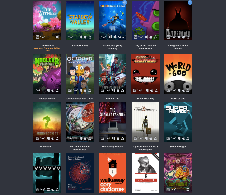 Voor een donatie van minimaal 30 dollar krijg je onder andere The Witness, Stardew Valley, Subnautica, Nuclear Throne, Invisible, Inc., Guacamelee! Super Turbo Championship Edition, The Stanley Parable en meer.