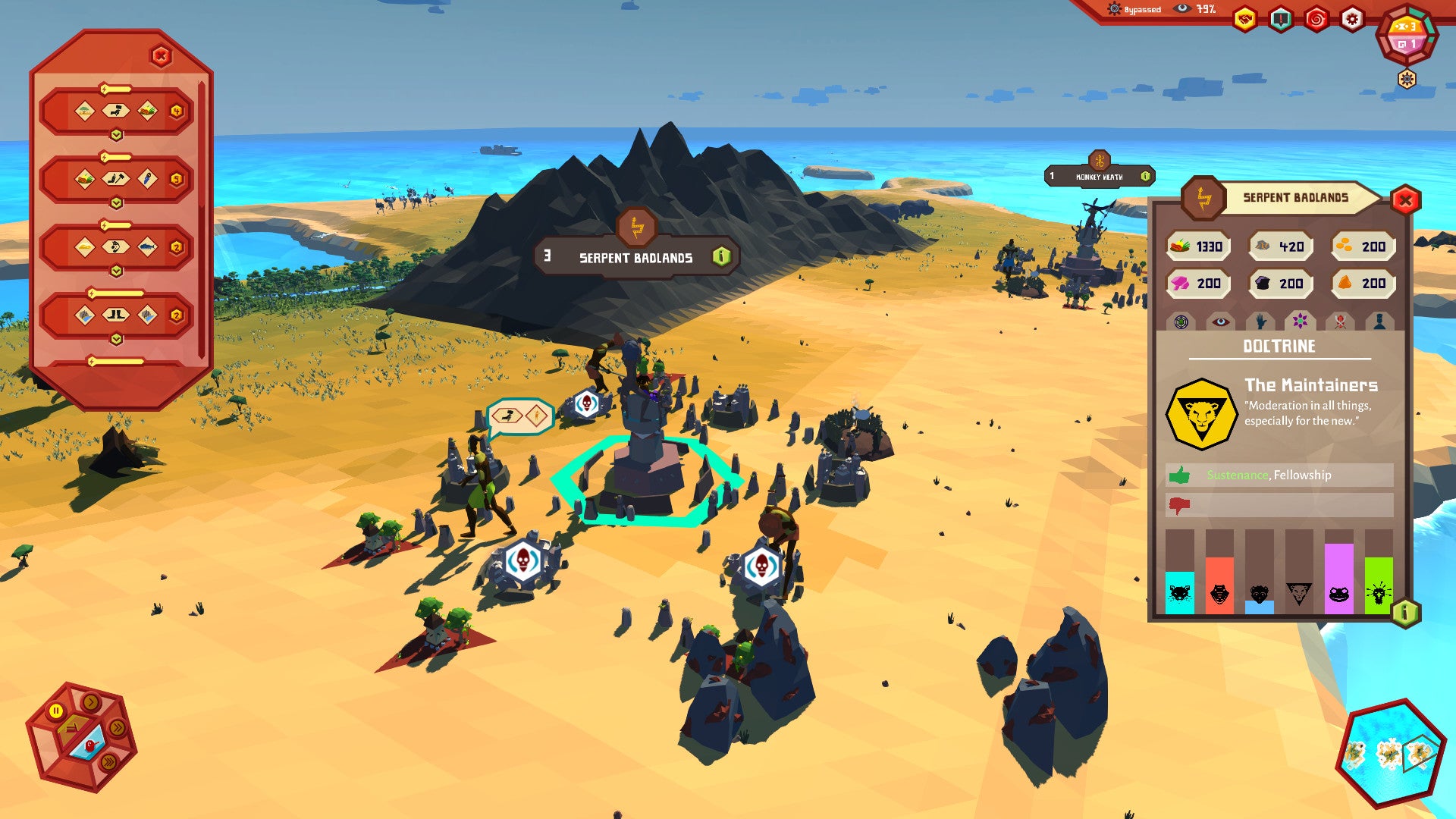 Je weet dus nooit op voorhand welke effecten een gebod precies zal hebben. Dat is vaak spannend en soms frustrerend, maar ook steeds fascinerend. En de complexiteit neemt nog eens flink toe wanneer je volkeren zich over de drie beschikbare eilanden beginnen te verspreiden. Ze stichten nieuwe steden, met elk hun eigen noden en interpretaties van jouw woorden. Vervolgens ontstaan er conflicten tussen verschillende stammen en beginnen ze oorlogen te voeren. Als de oorlog voorbij is, sturen ze diplomaten naar elkaar in de hoop om nieuwe handelsrelaties te stichten. In Crest voel je je vaak echt als een god die vol ongeloof naar dat gekke leven op de aarde onder hem zit te staren.