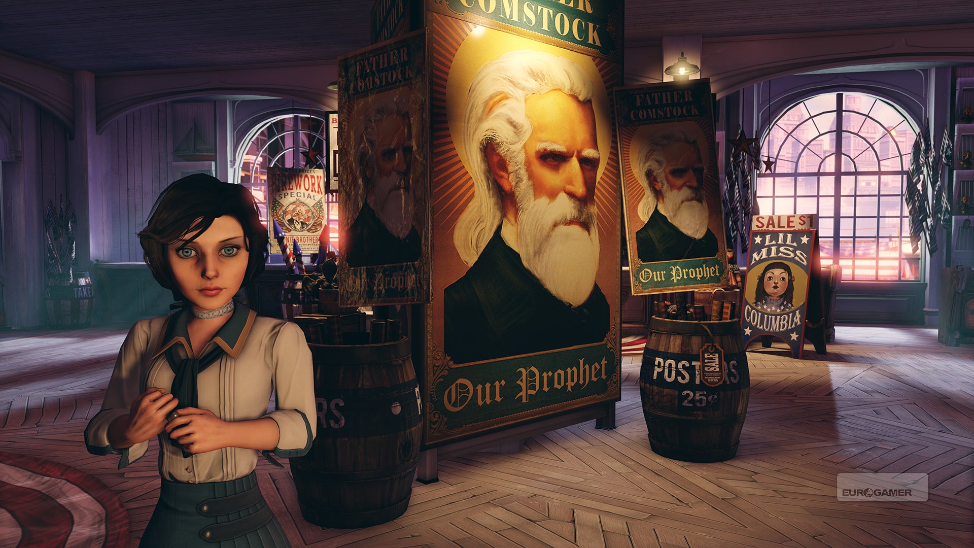 Robertson: De centrale figuur is ditmaal een persoon genaamd Comstock. Eén van de thema's is de manier waarop de inwoners van Columbia hem zien als een profeet, hoe hij die status gebruikt om over de stad te heersen en de reactie van de speler hierop. Ik wil niet te diep ingaan op hoe dat zal uitspelen of wat je te zien zal krijgen maar in vage termen is Columbia een stad gebouwd op de vergoddelijking van de stichters van de Verenigde Staten waaronder Washington, Jefferson en Franklin. Je zal veel standbeelden van hen tegenkomen in de stad en merken dat de bevolking hen vereert. Om in de stad toegelaten te worden moet je je ook eerst laten dopen. Anders ben je niet 'puur' genoeg. We halen dus ook enkele religieuze thema's erbij.