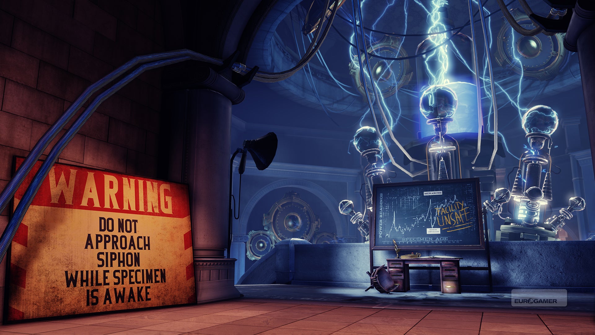 Robertson: Het is een moeilijke balans en in onze eerste pogingen waren we dan ook te verbaal. Het personage praatte gewoon te veel. We realiseerden ons dat we veel tekst konden schrappen en de speler die dingen voor zichzelf konden laten ontdekken. Op die manier kunnen ze zelf commentaar geven zonder dat Booker het in hun plaats moet doen. Het komt allemaal neer op die stem. Wat gaat Booker zeggen op dit moment om het verhaal vooruit te duwen of de relatie met Elizabeth te versterken? Moet hij echt 'Dit is een rode deur!' uitroepen om de speler te doen realiseren dat dat een rode deur is? Dat voorbeeld is voor de hand liggend maar die balans moet echt goed zitten. Er is geen magische formule voor. Je moet een zin erin steken en kijken of het werkt. En dat is deel van ons geheim. Je moet steeds opnieuw het spel spelen om een gevoel te krijgen van hoe vaak iemand praat, of ze de juiste dingen zeggen en of zich op de correcte manier gedragen. Als dat niet goed zit, moet je bereid zijn te knippen.