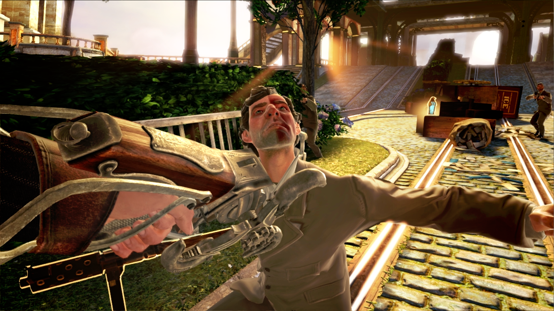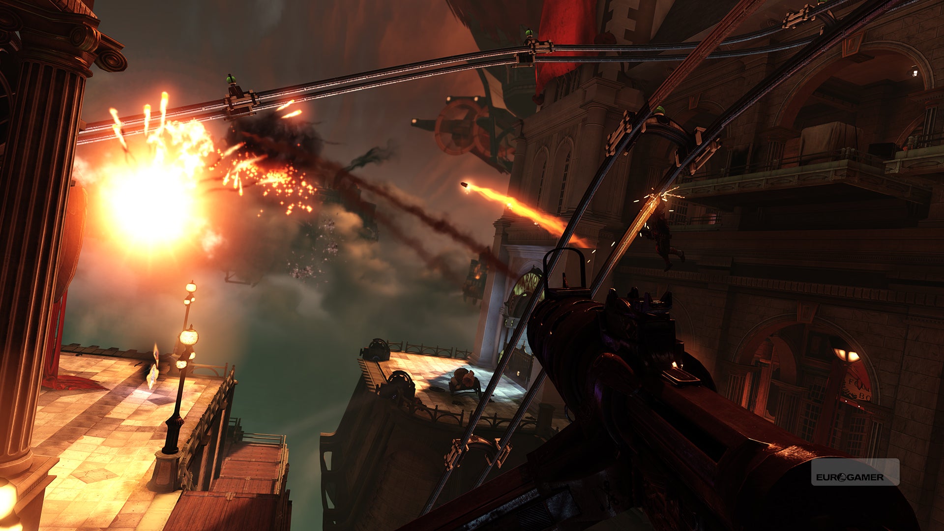 Robertson: Scott Sinclair, die de art director was voor Bioshock 1 en Bioshock Infinite, is degene die echt heeft zitten pushen om de stad eruit te laten zien zoals het nu is. Dat was namelijk niet altijd zo. Toen we voor het eerst een zwevende stad bouwden, deden we het heel somber. Het was donker, er hingen veel wolken en soms onweerde het. De stad werd gedomineerd door donkerblauw licht. Het voelde heel claustrofobisch om ingesloten te worden door al die wolken. Je kon niet ver kijken en je had ook niet het gevoel dat je in de lucht hing. Waar het op neer komt is dat we eigenlijk het water van Rapture hadden vervangen door lucht. Toen we dat merkten, hebben we eens goed nagedacht over het concept van 'een stad in de lucht'. We haalden alle wolken weg, haalden de zon erbij en zorgden ervoor dat we zo ver mogelijk konden zien.