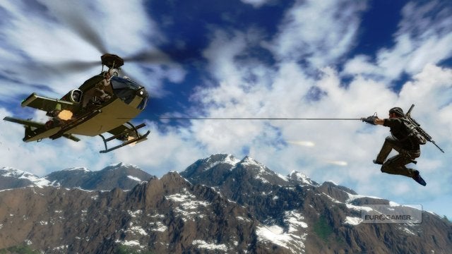 Eurogamer België: Laten we meteen zeggen dat Just Cause 2 er gruwelijk leuk uitziet! Een van de tofste dingen is zonder twijfel de Grappling Hook die Rico ten alle tijden kan gebruiken.