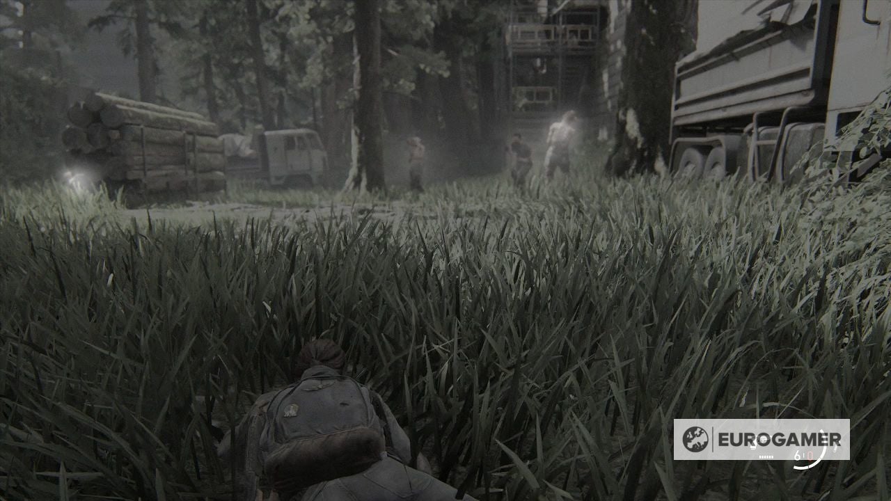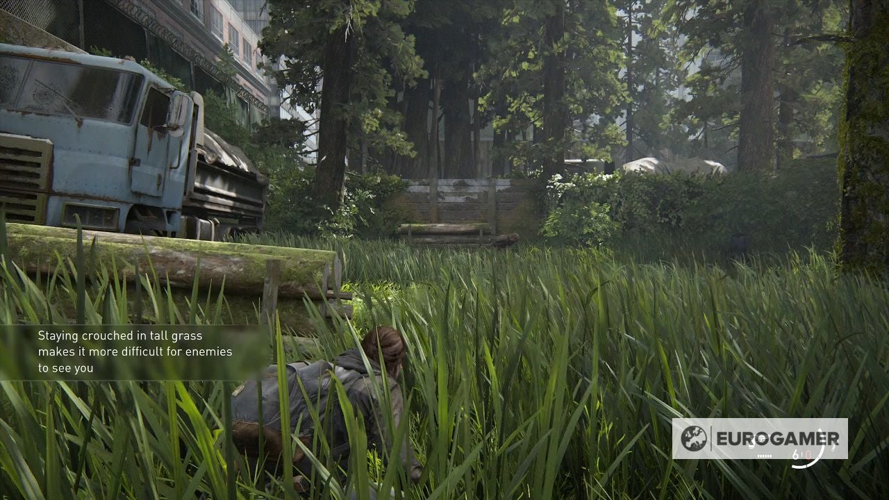 Er zitten geïnfecteerden tussen het hoge gras. Alhoewel je kunt kruipen om zo minder op te vallen, is het niet perfect. Gebruik dus fatsoenlijke beschutting totdat je de geïnfecteerden geruisloos kunt uitschakelen.