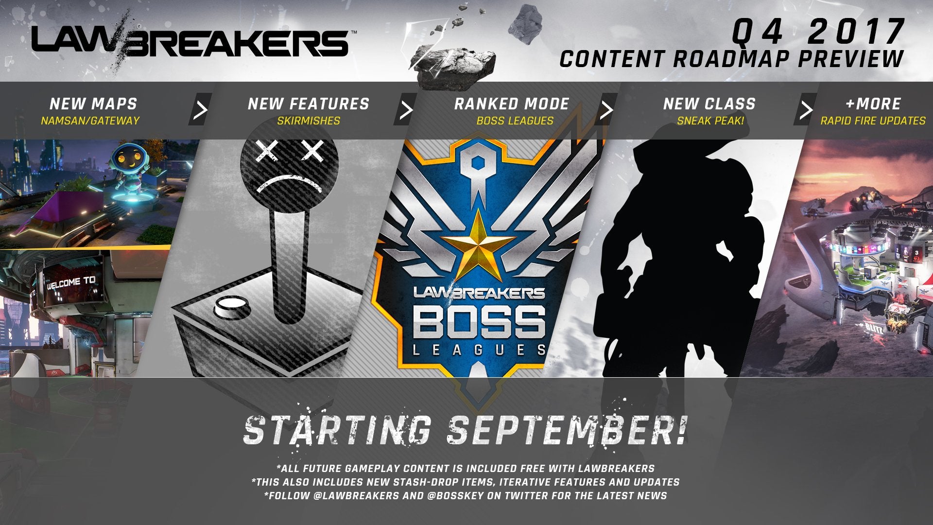 De twee nieuwe maps voor de game heten Namsan en Gateway. Daarnaast krijgt LawBreakers ook skirmishes en een ranked modus genaamd Boss Leagues. Ten slotte komt er een nieuwe class en een 'rapid fire update'. De updates lanceren ook in die volgorde.