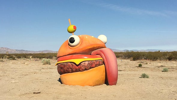 Een levensgrote Fortnite Durr Burger mascotte is verschenen in een woestijn nabij Paldale, Californië.