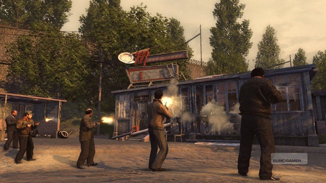Allereerst is de toon van Mafia II een stuk serieuzer dan die in GTA IV. Je moet je niet bezighouden met het onderhouden van relaties door met vrienden te gaan bowlen, terwijl minigames over het algemeen grotendeels uit den boze zijn. Ontwikkelaar 2K Czech (het vroegere Illusion Softworks) wil duidelijk een filmische ervaring neerzetten waarbinnen onnodig gedoe geen plaats heeft. In Mafia II speel je missies die draaien rond het reilen en zeilen van sleutelpersonages binnen het overkoepelende verhaal. Een van die missies gaat over een confrontatie met een rivaliserende bende, en wij mochten met de controller in de hand vanop de eerste rij meemaken hoe hoofdrolspeler Vito en zijn beste maatje Joe omgaan met dit soort explosieve situaties.