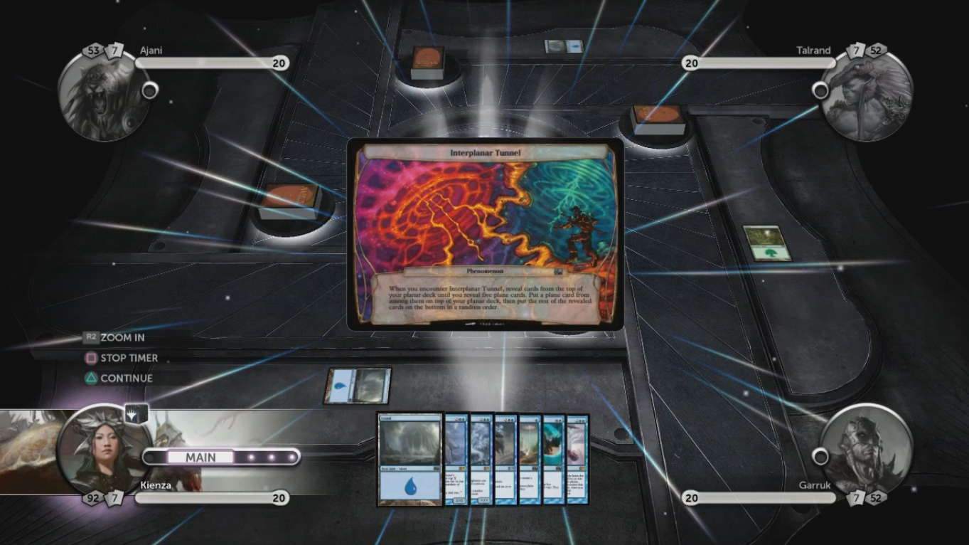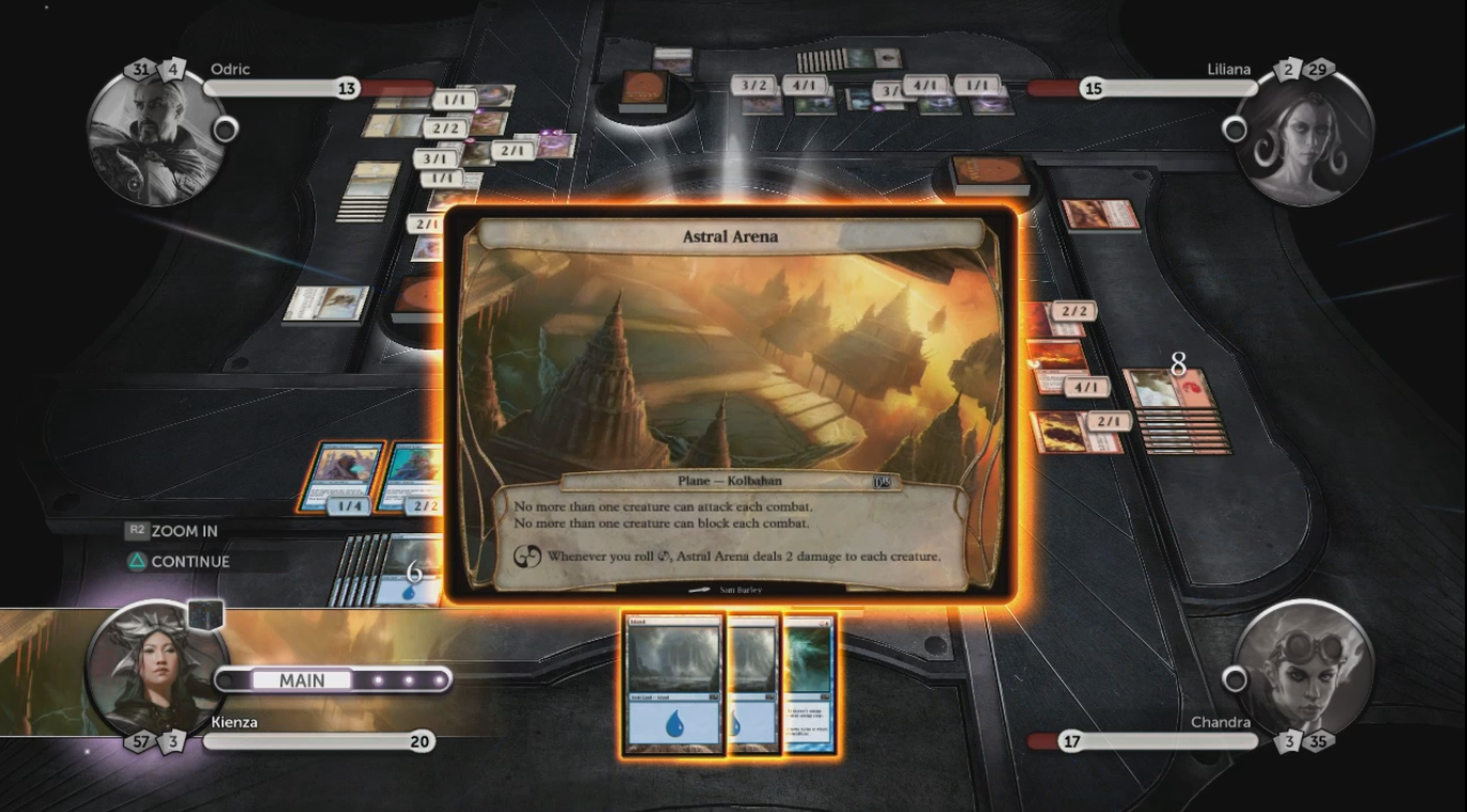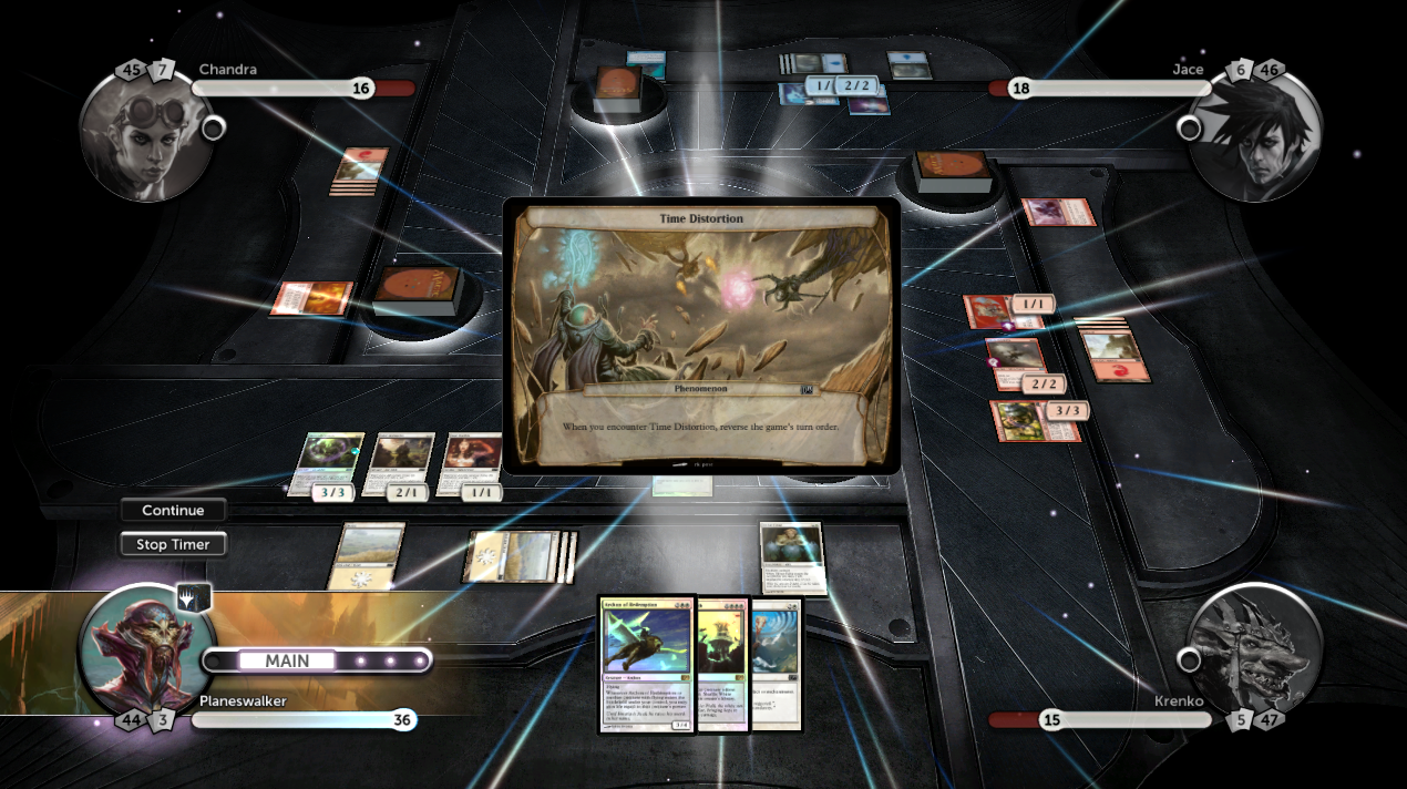 Tot slot is er nog de nieuwe Planechase-gamemode waarin op elk moment één omgevingskaart van kracht is. Deze heeft een permanent effect tot de kaart veranderd wordt omdat iemand met de dobbelsteen het Planechase-teken gooide. Het idee achter Planechase is niet slecht, maar de effecten zijn soms bijzonder frustrerend en bij momenten zo ingrijpend dat een overkoepelende strategie nooit lang standhoudt, wat in mijn ogen betreurenswaardig is. Denk hierbij aan het opnieuw op het slagveld plaatsen van alle monsterkaarten in iedereens graveyard, het toekennen van deathtouch aan alle monsters of gewoon alle monsters van tafel te vegen. Een potje met vrienden kan misschien nog amusant zijn, maar mocht Planechase speelbaar zijn in het echt, zouden 90% van de competitieve wedstrijden gegarandeerd eindigen met de gefrustreerdste speler die het hele bord van tafel gooit.