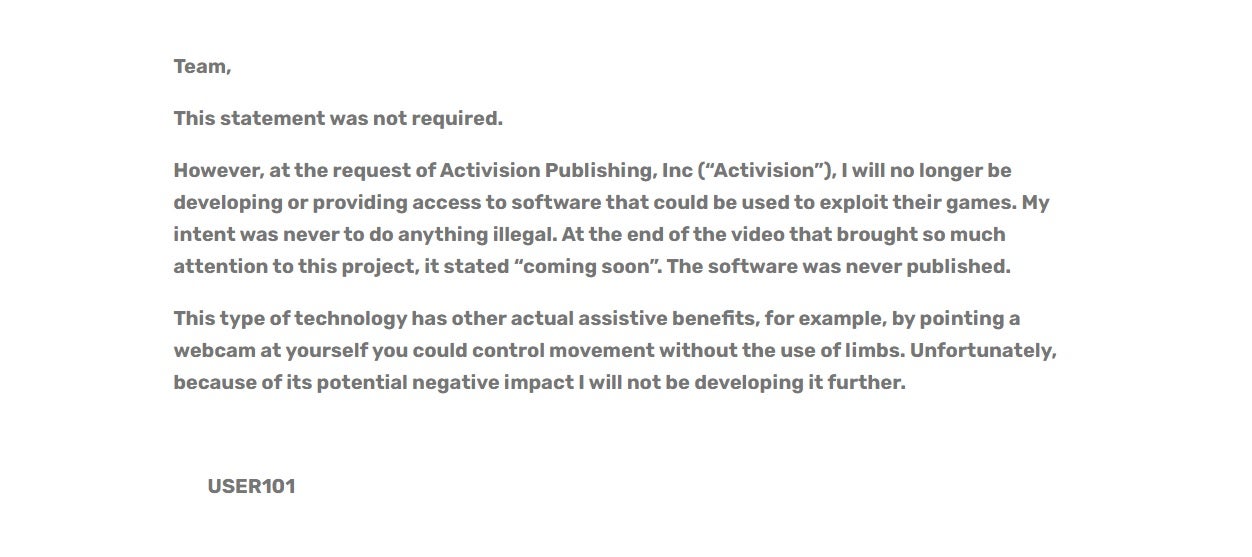 Verder schreef de ontwikkelaar van de tool nog een verklaring waarin hij aangeeft dat hij nooit "de intentie had om iets illegaals te doen". USER101 zegt verder dat hij dit type technologie ontwikkelde voor zijn assisterende voordelen. Zo kun je een webcam op jezelf richten en ingame bewegingen maken zonder je ledematen te gebruiken.