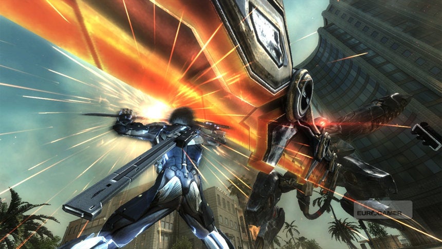 En in die actie is de hand van Platinum Games direct zichtbaar: de snelheid ligt hoog wanneer Raiden over muren en daken rent en tussen de benen van een enorme mech duikt om hem vervolgens aan een zweep weg te slingeren. Hij slaat met gemak door pilaren en voertuigen heen om bij zijn tegenstanders te komen die hij vervolgens in slowmotion om het leven brengt. Het is spectaculair en behoorlijk over the top, al helemaal wanneer Raiden over raketten heenrent om bij een aanvalshelikopter te komen, die hij vervolgens ook gewoon in mootjes hakt. Bayonetta en Vanquish zijn zonder twijfel het lichtende voorbeeld geweest.