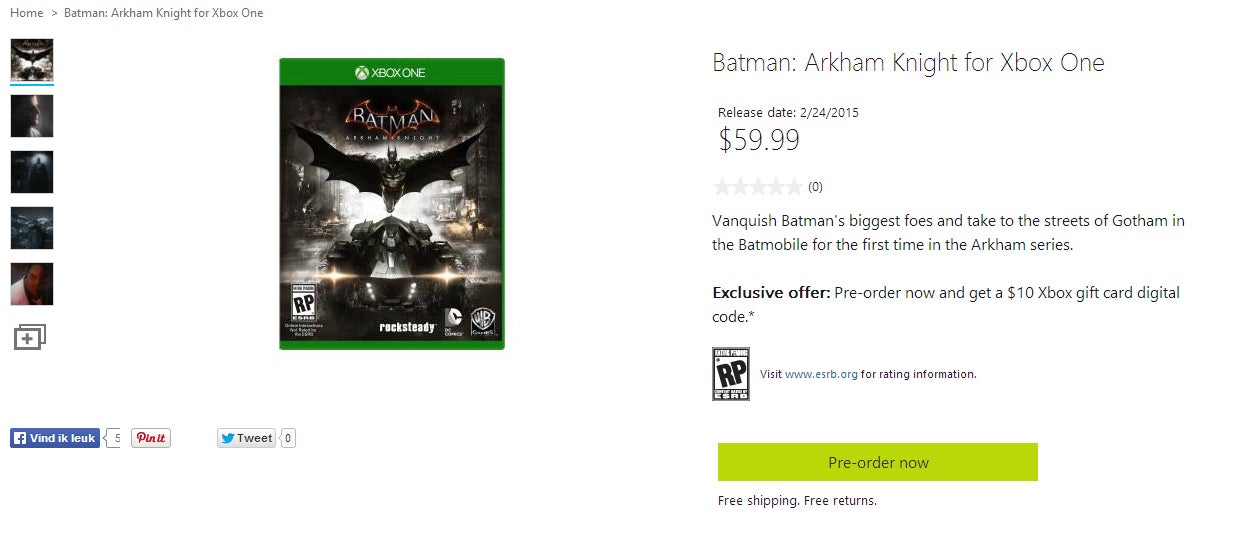 Microsoft noemt op een productpagina in de Microsoft Store de releasedatum van Batman: Arkham Knight: 24 februari 2015. De derde Batman-game van Rocksteady Studios zou oorspronkelijk dit jaar nog uitkomen voor de pc, PlayStation 4 en Xbox One.