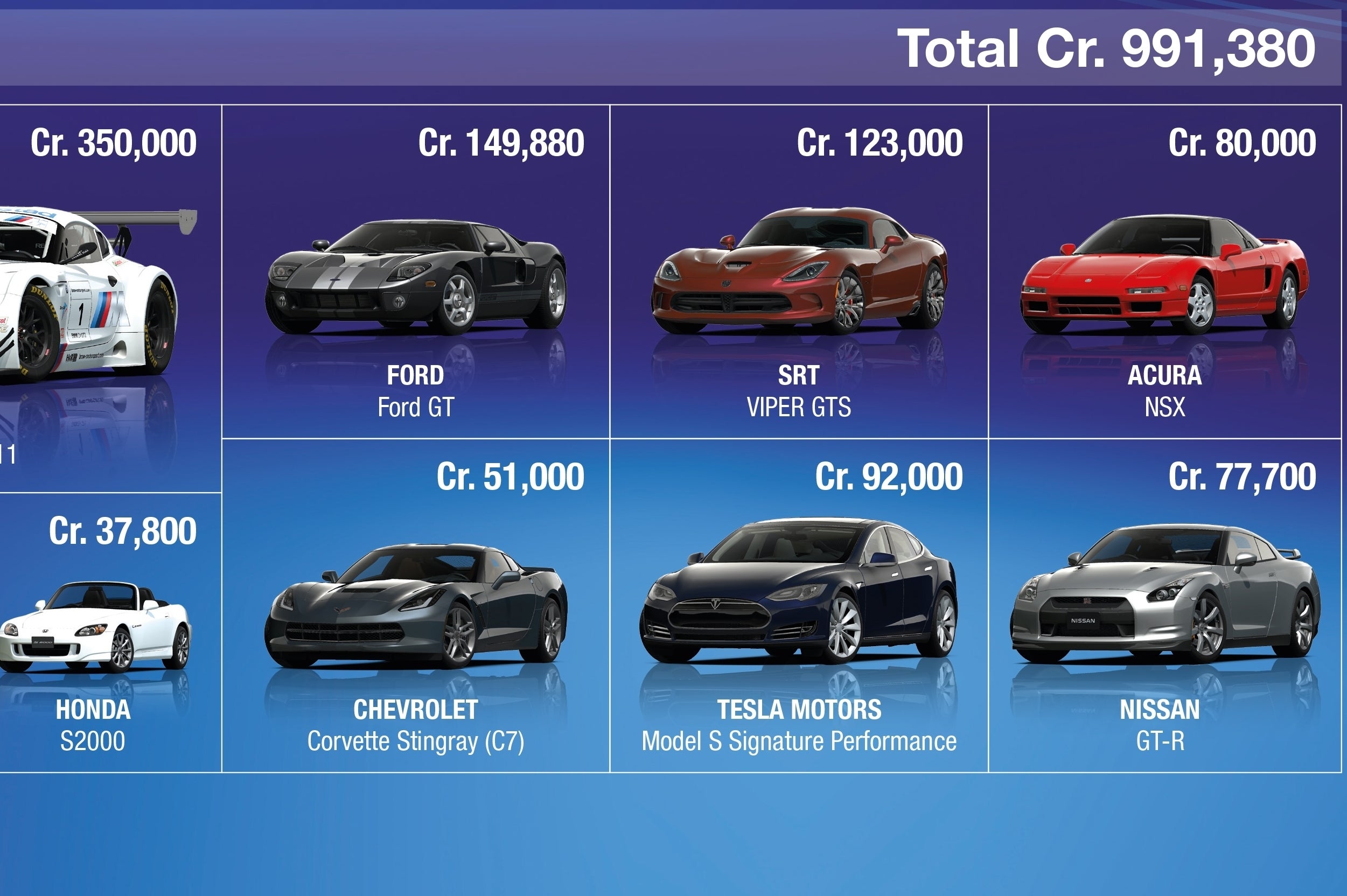 Hoeveel credits kosten in je lokale valuta is nog niet duidelijk. Wel plaatste Sony een afbeelding online met daarop voorbeelden van de wagens die te koop zijn. Voor een miljoen credits koop je zo negen extra auto's.