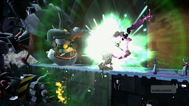 Als dan ook nog eens een immens grote robot jou begint te achtervolgen, wordt duidelijk dat Ms. Splosion Man een stuk cinematischer is opgebouwd. Een mooie belofte, maar een element dat daarna zelden terugkomt. Alleen bij baasgevechten begint de game weer echt filmisch aan te voelen, maar deze zelfde gevechten komen er makkelijk en beholpen van af. Aan de ene kant begrijpelijk: je kunt immers maar zoveel doen met een enkele actieknop. Meer uitdagende baasgevechten zou je echter wel verwachten in een spel dat zo sterk uit de verf komt qua moeilijkheidsgraad van de levels.