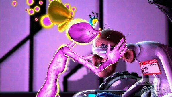 We ontmoeten een vrouwelijke Splosion Man (Woman?), die gameplay-technisch hetzelfde in elkaar steekt als haar mannelijke wederhelft. De naam en het strikje dat ze draagt lijken ook eerder een steek naar Midway te zijn, die meer dan twintig jaar geleden een vrouwelijke markt hoopte aan te trekken door van game-icoon Pac-Man een vrouw met een roze strik te maken. Daarmee begint direct een myriade aan gamereferenties, opgevolgd door Donkey Kong kanonnen, een Super Mario overworld en Mega Man-achtige baasgevechten.
