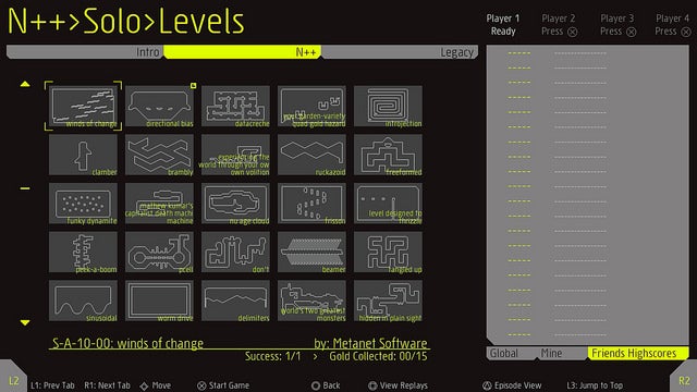 Het grote aantal levels is echter ook een belemmering. Wanneer je erin slaagt om een meesterlijke score neer te zetten, dringt het al snel door dat het slechts 1 van de 1125 levels is. Je vraagt je na een aantal uurtjes af wat voor zin het nog heeft verder te gaan, als je de game niet echt uit kunt spelen. Daarnaast ervaar je al vroeg in de game dat je score binnen een mum van tijd wordt ingehaald door andere spelers. De strijd is dus nooit in één keer gestreden, maar vraagt om herhaaldelijk aanvallen op een nieuw record. Eeuwige roem is bij N++ slechts voor enkelen weggelegd.