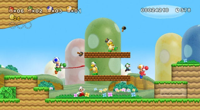In New Super Mario Bros Wii, de titel duidt op een overwerkt marketing departement, speel je een aantal platformlevels door. De bedoeling is simpel, ontwijk of bespring vijanden, verzamel munten en upgrades voor je personage en … haal de hoogste score door de andere personages de loef af te steken.