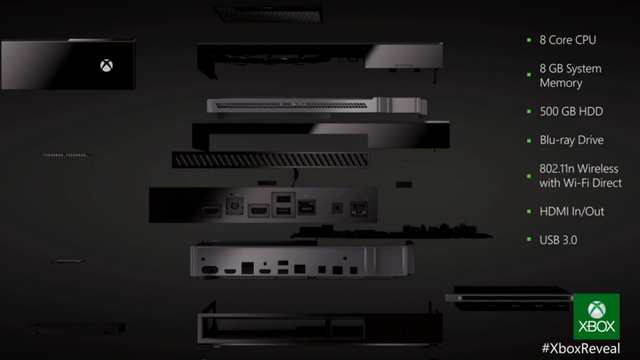 De Xbox One krijgt 8GB aan DDR3 RAM, een 500GB harde schijf, een speciale AMD octocore chip die - volgens Microsoft - "vier maal stiller werkt dan [de chip in] de Xbox 360", een blu-ray drive HDMI 1.4 output, USB 3.0 poorten, 1080p en 4k ondersteuning, WiFi Direct, 7.1 surround sound, twee 802.11n radio's en, zoals eerder vermeld, een Kinect sensor (250.000 pixels infrarood dieptelens, 720 pixels webcam).