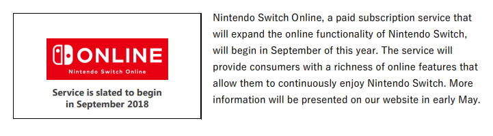 In een door Nintendo gepubliceerd document van de financiële resultaten blikt de Japanse fabrikant vooruit op het komende fiscaal jaar. Daarin meldt Nintendo onder meer dat er begin mei meer informatie over de online service komt. Daarnaast wordt nogmaals bevestigd dat Nintendo Switch Online begin september van dit jaar van start gaat.