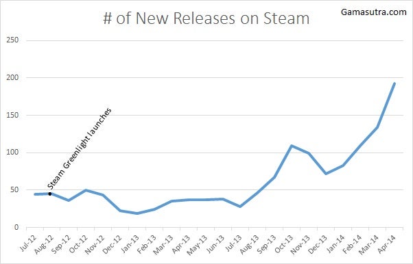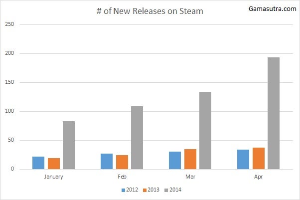 In 2014 zijn er tot nu toe al meer nieuwe games op Steam uitgekomen dan in heel 2013. Waar er in april 2013 nog geen vijftig nieuwe titels op het platform verschenen, zijn dat er nu al bijna 200.