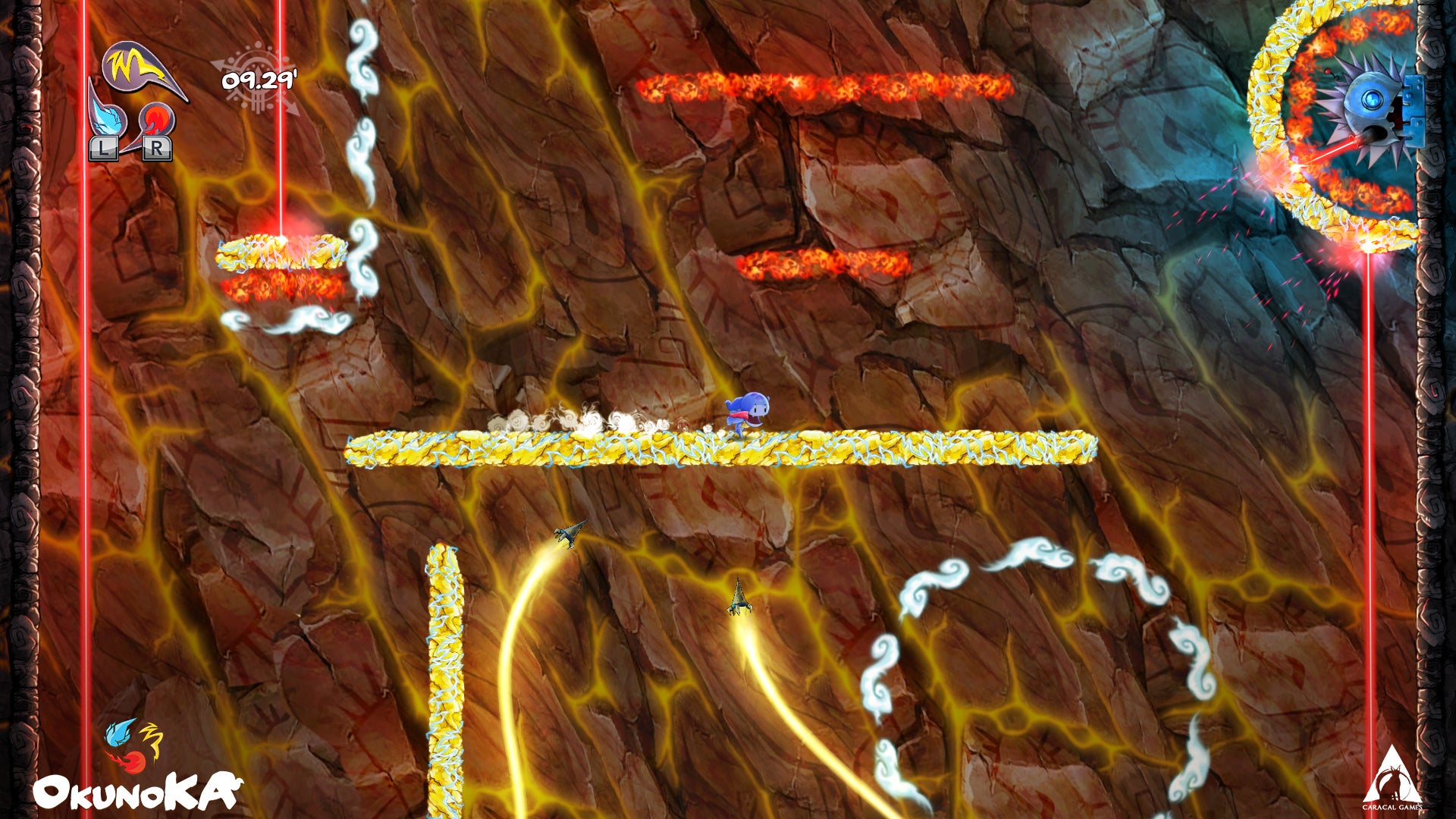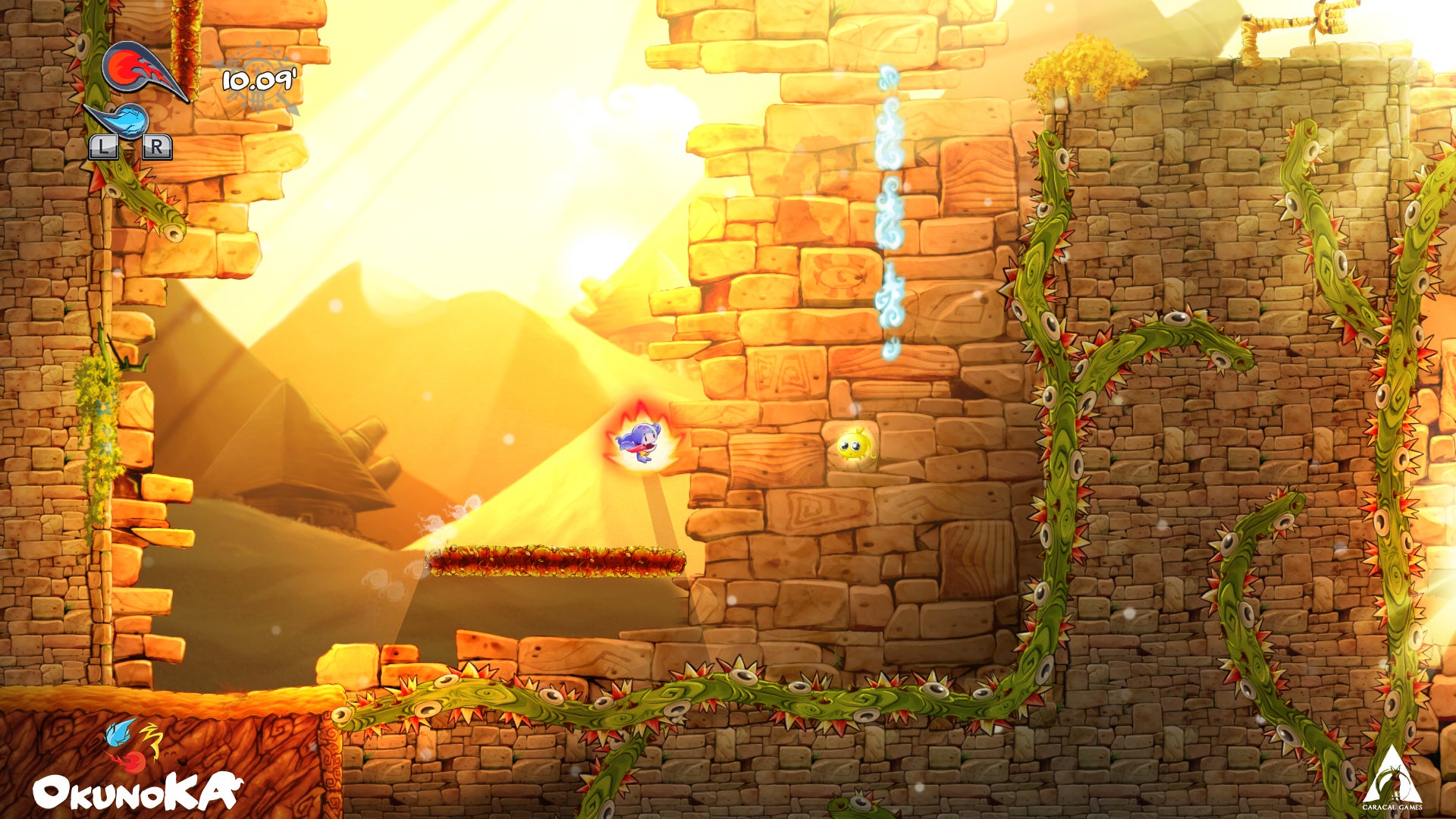 Wat daaraan bijdraagt, is dat geleidelijk telkens nieuwe obstakels worden geïntroduceerd, steeds een stapje moeilijker. Als Ka kun je gekleurde platformen laten verdwijnen en weer tevoorschijn toveren. Eerst slechts één kleur om te wennen, maar mettertijd heb je drie soorten om met elkaar af te wisselen. Dikwijls hangen levels niet alleen van je vingervlugheid af, maar is het een hele puzzel om op deze manier de juiste weg voor jezelf vrij te maken. Dit terwijl je ondertussen ook de nodige stekels en laserstralen dient te ontwijken. En dan sta je ineens in een lavawereld, waar je de grond maar kort mag aanraken. OkunoKA houdt je op deze manier steeds scherp en valt niet snel in herhaling.
