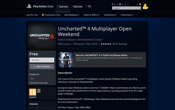 ORIGINEEL: Sony verklapt in de PlayStation Store dat er aankomend weekend een open bèta van de multiplayer van Uncharted 4: A Thief's End plaatsvindt. Hoewel het bedrijf nog geen officiële aankondiging heeft gedaan, is er in de Store tijdelijk een pagina voor geopend geweest.