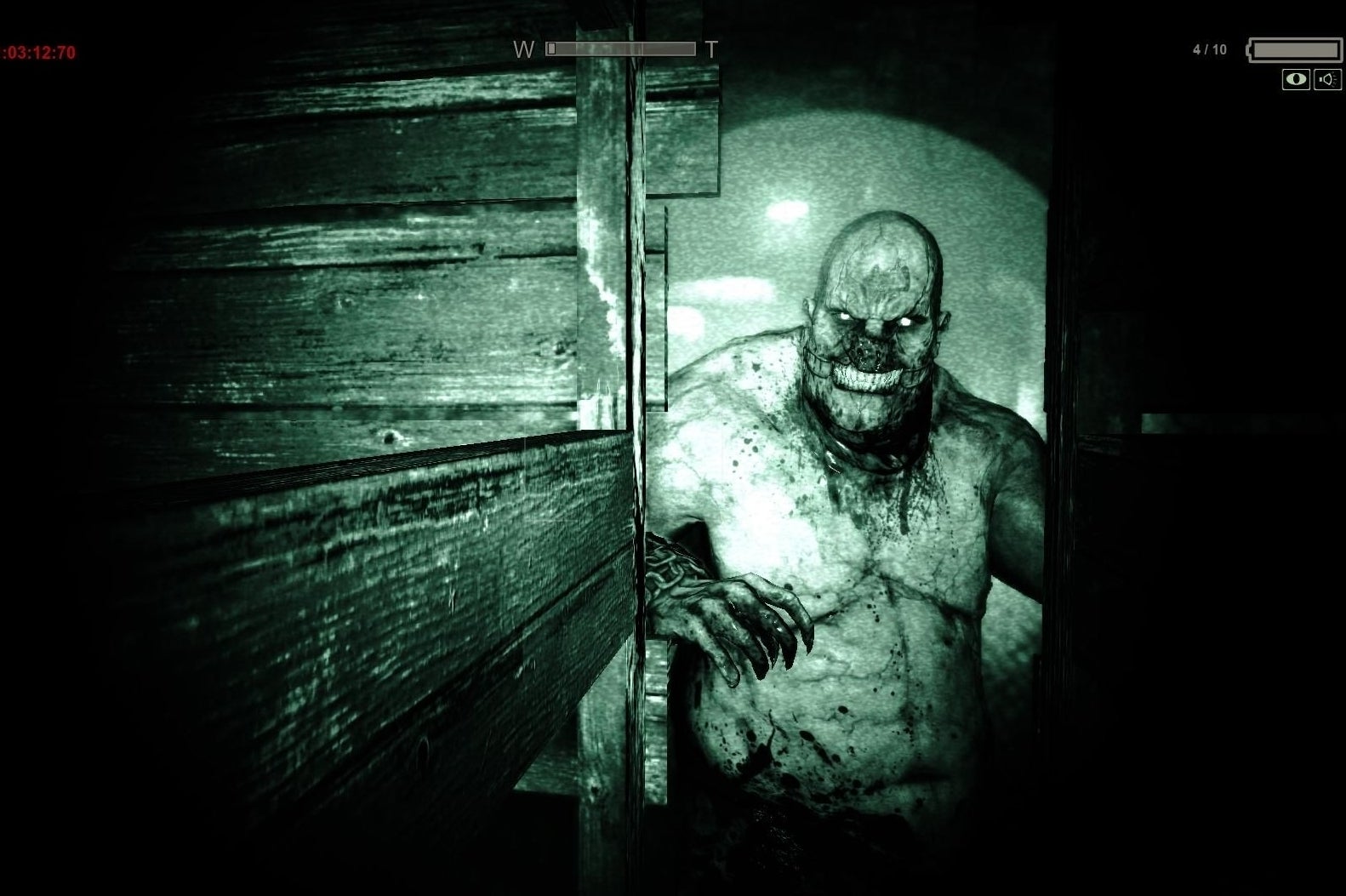 In Outlast is je camera dan ook een noodzakelijk kwaad. In het gesticht is het veelal pikkedonker, dus word je gedwongen je camera op de duisternis waar je doorheen moet te richten. Je zet de nightvisionstand aan en hoort het bekende piep-zoemgeluidje. Je gezichtsveld is plots door de donkere randen om het scherm beperkt en langzaamaan worden de contouren van de kamer om je heen in een zee van spookachtig groen licht zichtbaar. Miles ademt telkens luider, dieper, paniekeriger en alsmaar zit je op het puntje van je stoel, omdat je ondertussen weet dat een schrikmoment dan niet meer ver af is.
