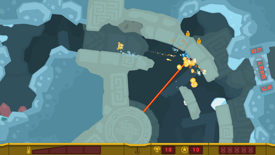 Een andere nieuwe toevoeging is de "Hungry Suit". In bepaalde levels kom je een soort steen tegen (nierstenen?) waar je vuurkracht niet tegenop kan. In de buurt is er dan wel een soort puistbubbelmeeëterwormding waarin je je kunt nestelen. Doe dit en je krijgt een soort "pak" aangemeten waarmee je de stenen kunt kapotbijten, of nog grotere stenen kunt wegduwen. De beweging van het schip is dan wel een stuk beperkter geworden. Het lichtelement, de Hungry Suit, de vloeistoffen, ... hebben het puzzelelement in het spel alvast gevoelig verhoogd. We raden wel aan de diamanten die je ziet telkens als eerste werk op te rapen. Er is net als in het origineel telkens een bepaald aantal nodig om nieuwe levels vrij te spelen. In de beginlevels gaat dat nog relatief gemakkelijk, maar later wordt dat al een stuk minder vanzelfsprekend.