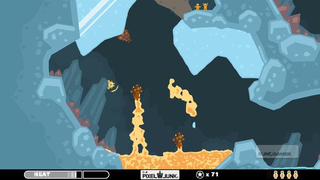 Allereerst spelen vloeistoffen een grote rol in PixelJunk Shooter. Je hebt water, lava en een olieachtige substantie, en deze drie dingen brengen wanneer ze met elkaar in aanraking komen een bepaalde reactie voort. Zo doet water de gloeiend hete lava stollen, terwijl de combinatie H2O + zwart goedje zorgt voor hete, ontvlambare dampen. Deze dingen zijn belangrijk om te onthouden gezien je ruimteschip enkel bestand is tegen water. Hitte verdraagt het ding niet en bij een te hoge temperatuur – bijvoorbeeld door te dicht bij lava te vliegen – ontploft de boel. Je op een zorgvuldige manier manoeuvreren doorheen de levels is dus geen overbodige luxe.