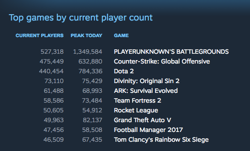 PlayerUnknown's Battlegrounds passeerde eerder de grens van 1 miljoen gelijktijdige spelers. Daarnaast is PlayerUnknown's Battlegrounds de meest gespeelde Steam game sinds eind augustus en laat de game zijn directe concurrent DOTA 2 ver achter zich.
