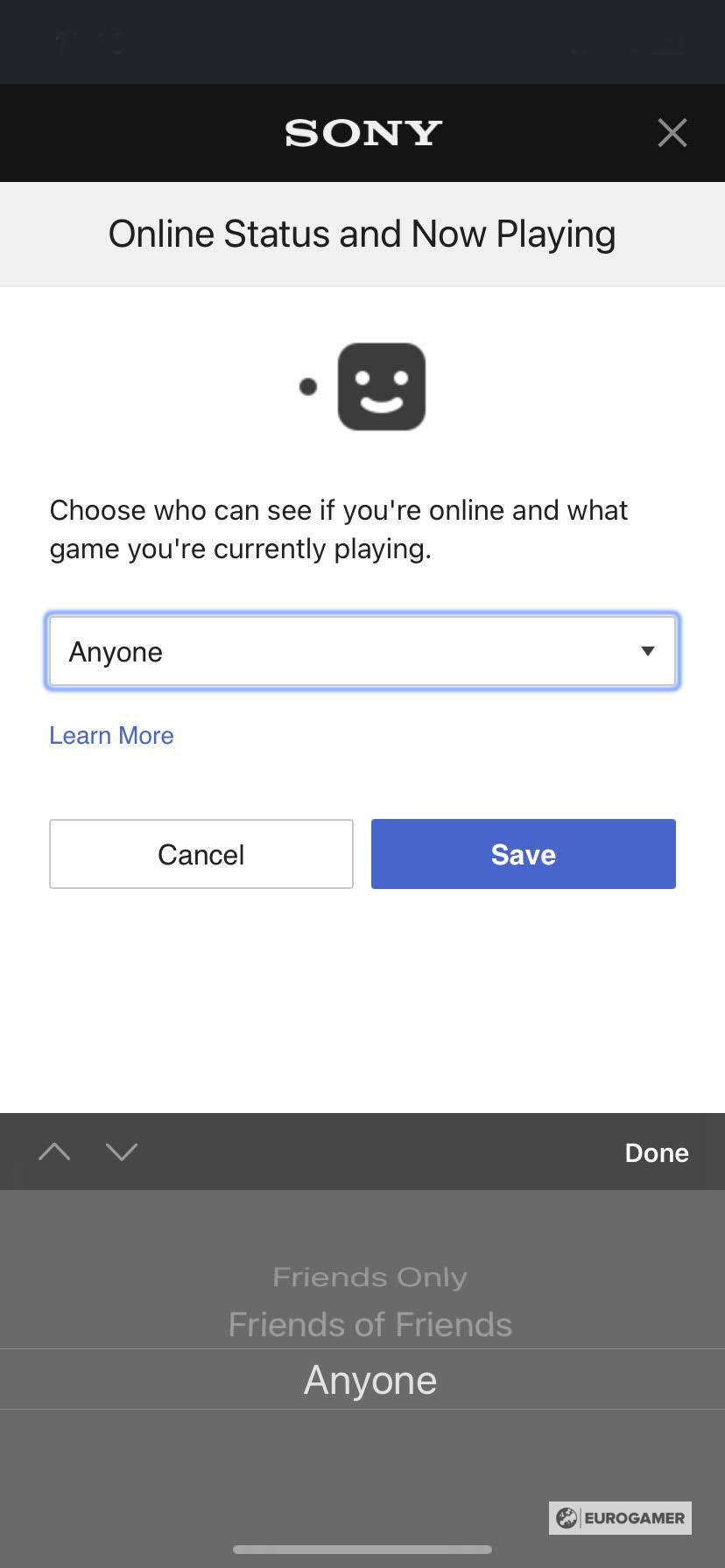 Je kunt beslissen wie je online status kan zien, inclusief de game je momenteel speelt, met de opties: Anyone, Friends of Friends of Friends Only.