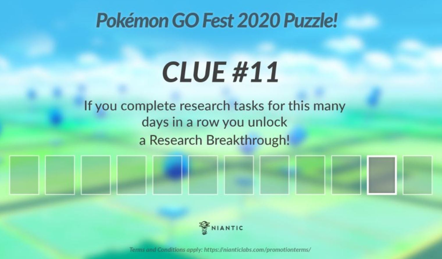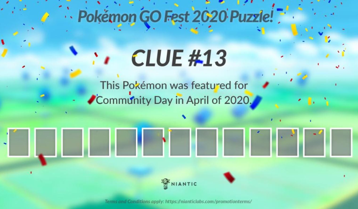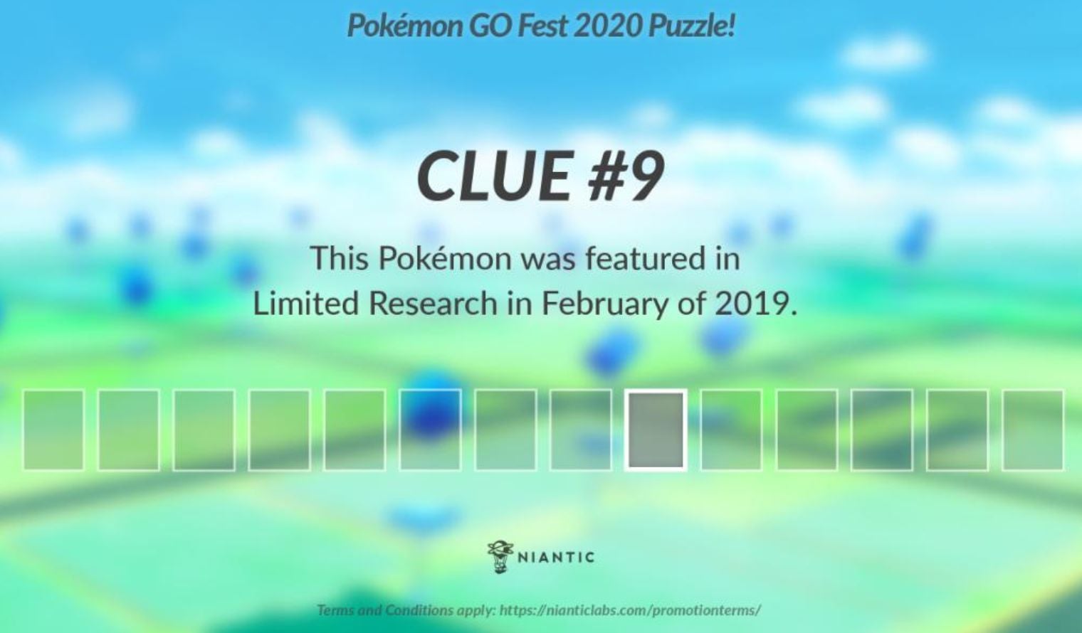 De Pokémon Go Fest 2020 puzzel bestaat uit 13 aanwijzingen die gegeven werden tussen donderdag 16 juli en woensdag 22 juli .