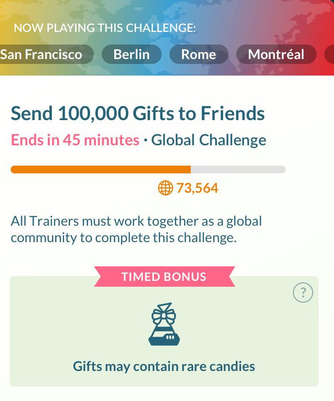 De challenges zelf zijn gevarieerd, van een aantal gifts sturen tot het vangen van bepaalde Pokémon types. Wanneer de community een doel bereikt, dan zal er een Timed Bonus voor die challenge beginnen voor alle spelers, maar deze duurt maar tot het einde van dat uur.
