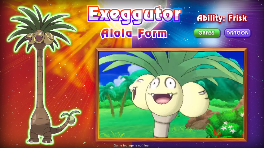 In Pokémon Sun en Moon worden oude Pokémon in een nieuw jasje gestoken. Bepaalde Pokémon van de eerste generatie hebben een zogenaamde Alolan Form. Die is ontstaan omdat de Pokémon zich aan het klimaat en de levensomstandigheden in de Alola-regio hebben aangepast. Ze zien er niet alleen anders uit, maar krijgen zelfs meer of andere types. Zo is een Alolan Vulpix geen Fire-, maar een Ice-type, en krijgt de Alolan Exeggutor naast een erg lange nek ook het Dragon-type.