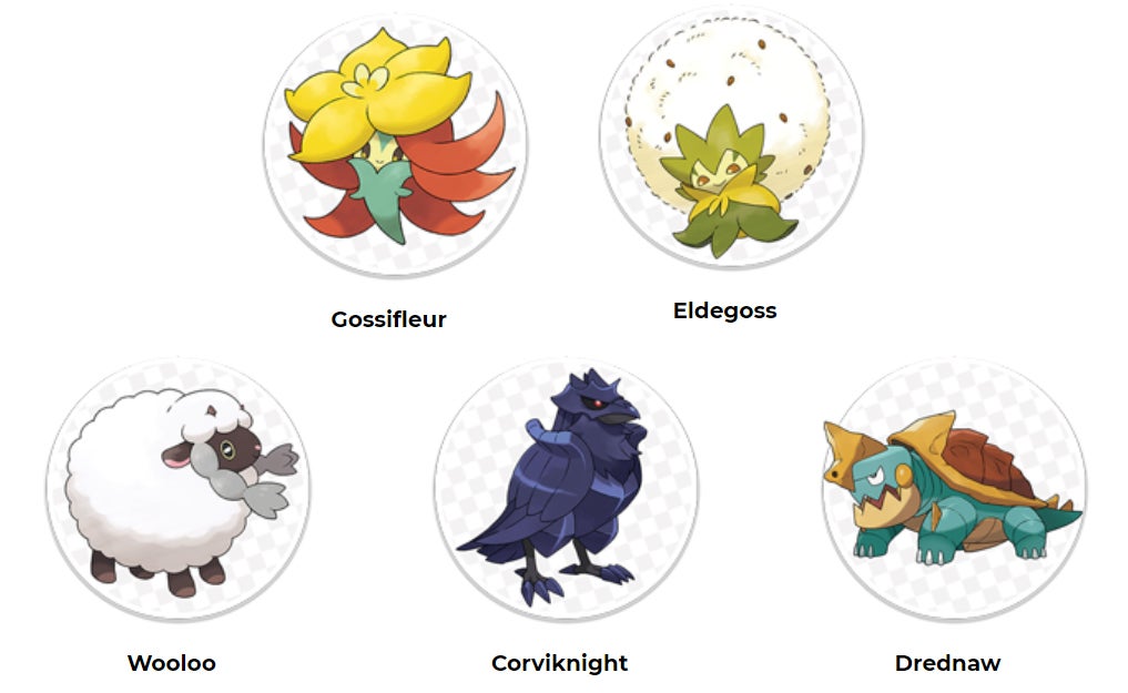 Een van de meest voorkomende Pokémon in Galar is Wooloo, een schaap van het Normal-type. Daarnaast is Gossifleur een Grass-type die evolueert in Eldegoss. Corviknight is een imponerende vogel van het type Flying en Steel. Deze Pokémon heeft dan ook de move Fly, wat fast travel mogelijk maakt. Drednaw valt dan weer op doordat zijn type zowel Rock als Water is, twee elementen die normaliter juist tegenover elkaar staan.