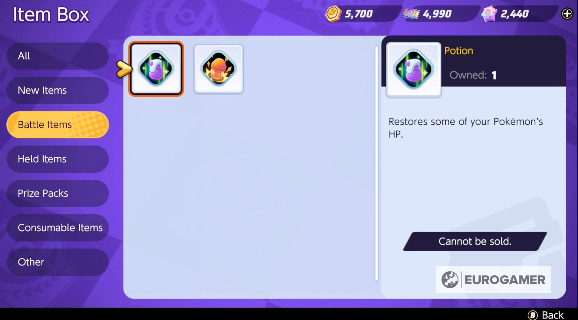 Het eerste is Potion - dit is de allereerste 'Battle Item' die je vrijspeelt en waarmee je een kleine hoeveelheid gezondheid terugkrijgt. Met een cooldown van 30 seconden helpt dit item je om lastige situaties te overleven of je de boost te geven die je nodig hebt om een tegenstander te verslaan.